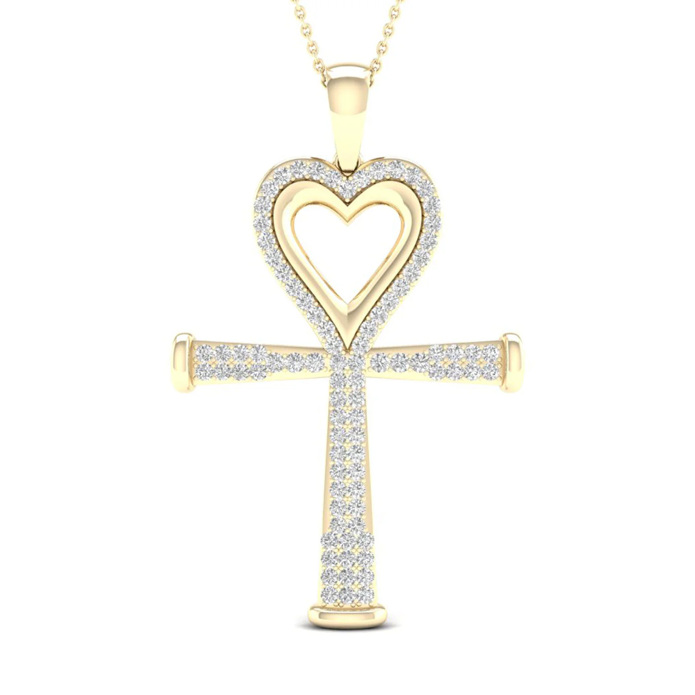This exquisite 10K Yellow Gold Pendant brings a heartfelt expression to a classic symbol, featuring an ankh with a central heart, outlined and highlighted by diamonds totaling 0.20 carats with H-I color and I1-I2 clarity. It’s a piece that beautifully marries devotion with a touch of elegance.