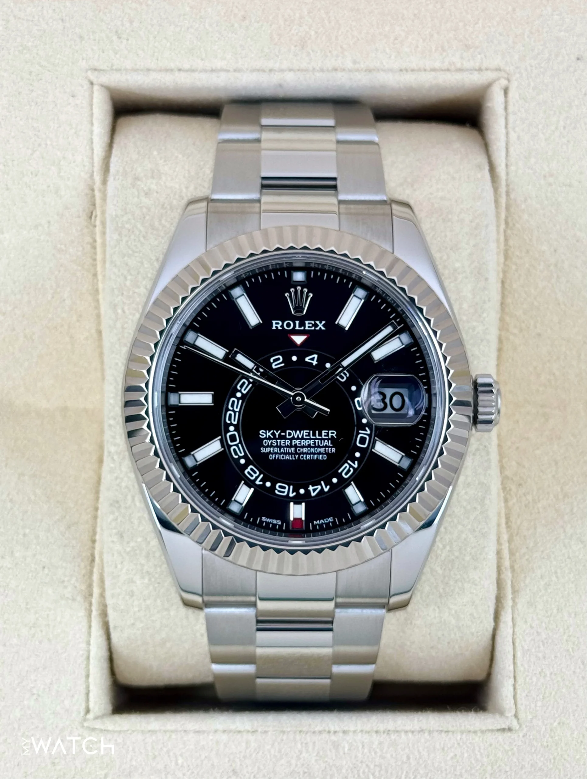 2019 Rolex Sky-Dweller 42mm 326934 Stainless Steel and 18k White Gold Fluted Bezel Oyster Bracelet Black Dial