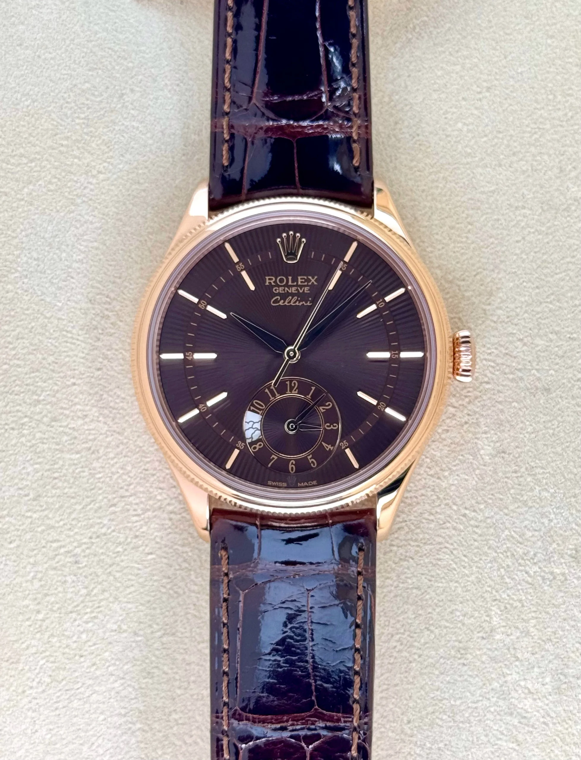 2020 Rolex Cellini Dual Time 39mm 50525 Rose Gold Brown Dial