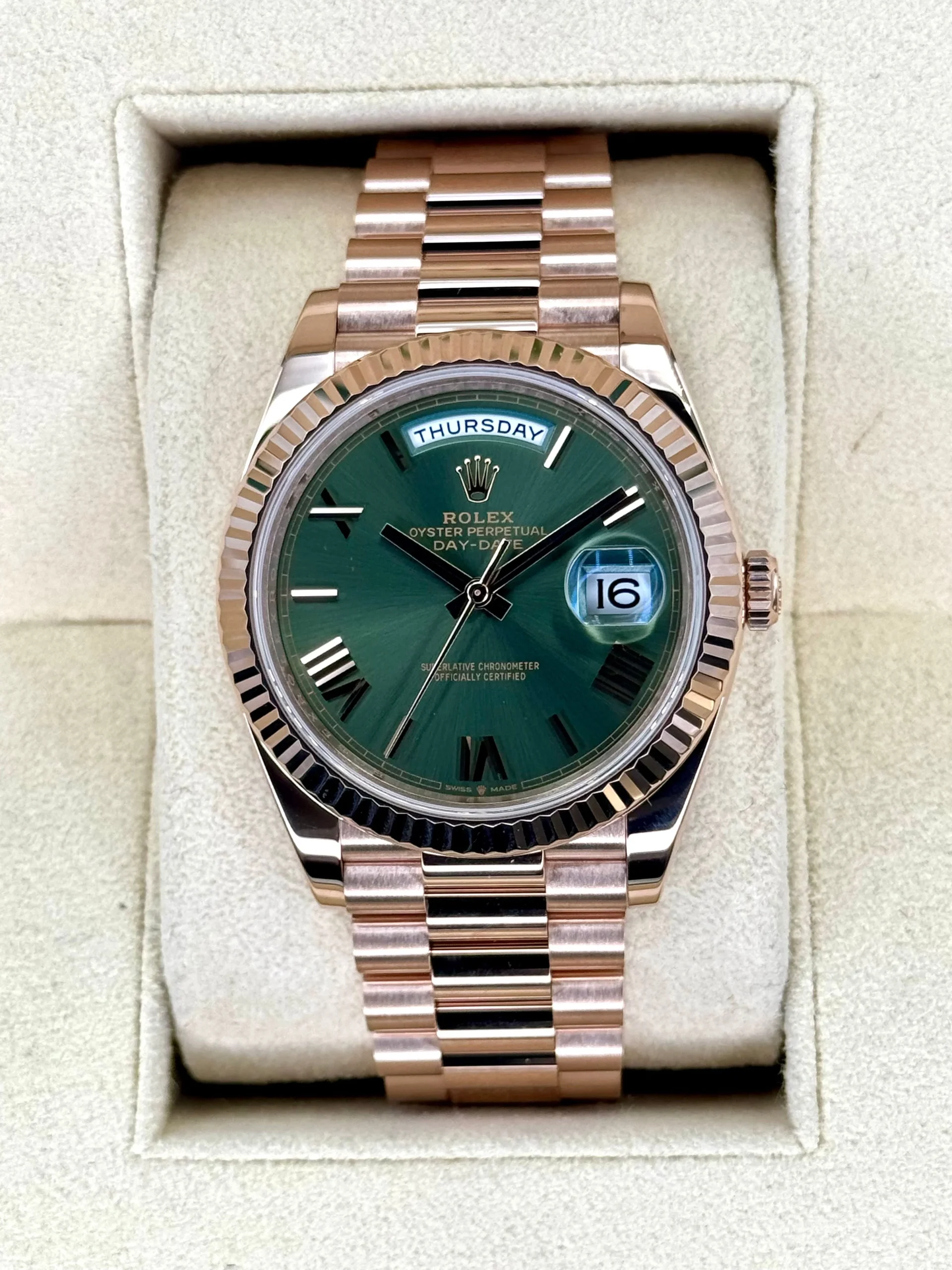 2022 Rolex Day-Date 40mm 228235 Presidential Bracelet 18kt Everose Gold with Olive Green Dial and Fluted Bezel