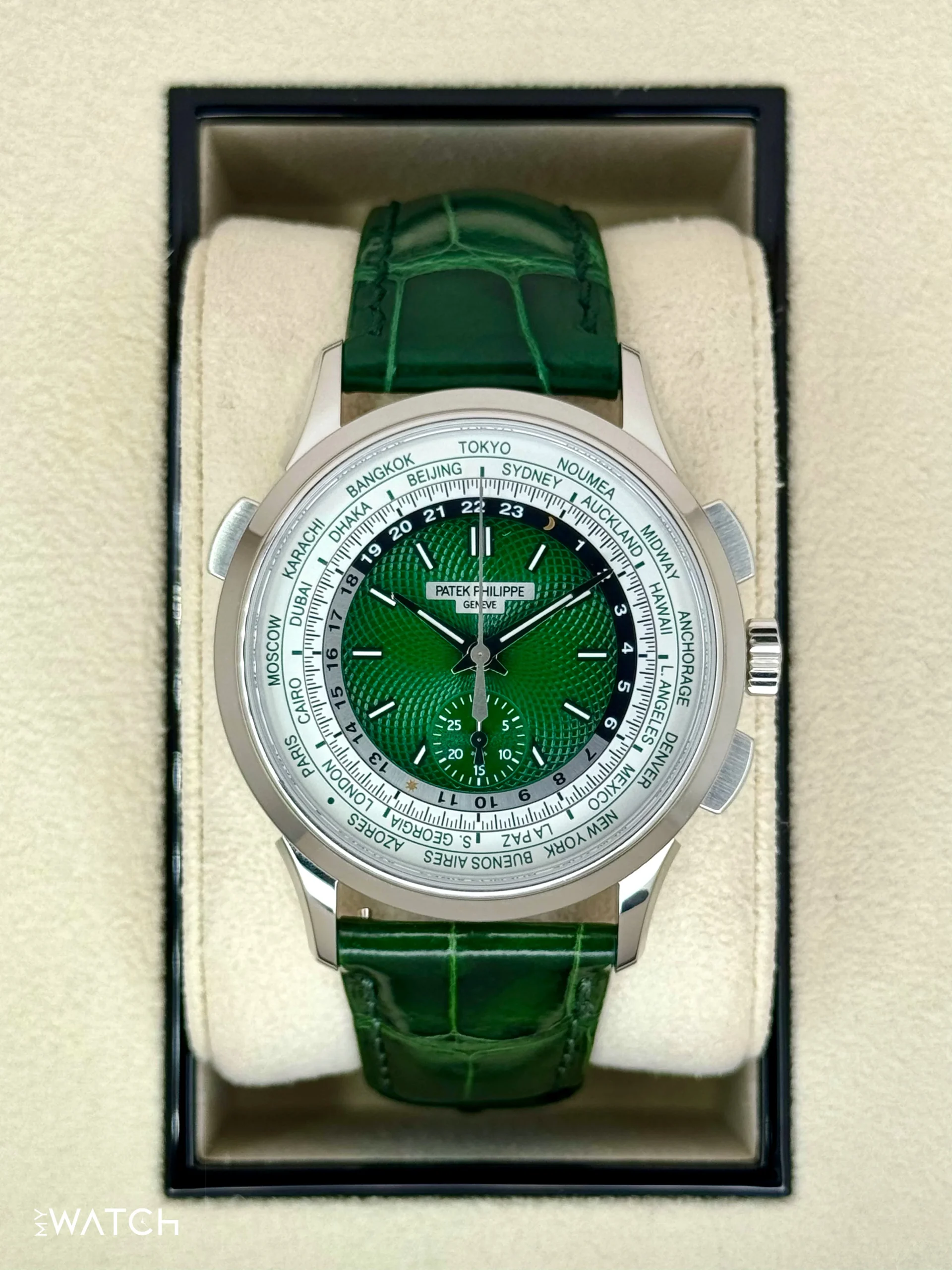 2023 Patek Philippe World Time Flyback Chronograph 39.5mm 5930P Platinum Green Guilloched Dial