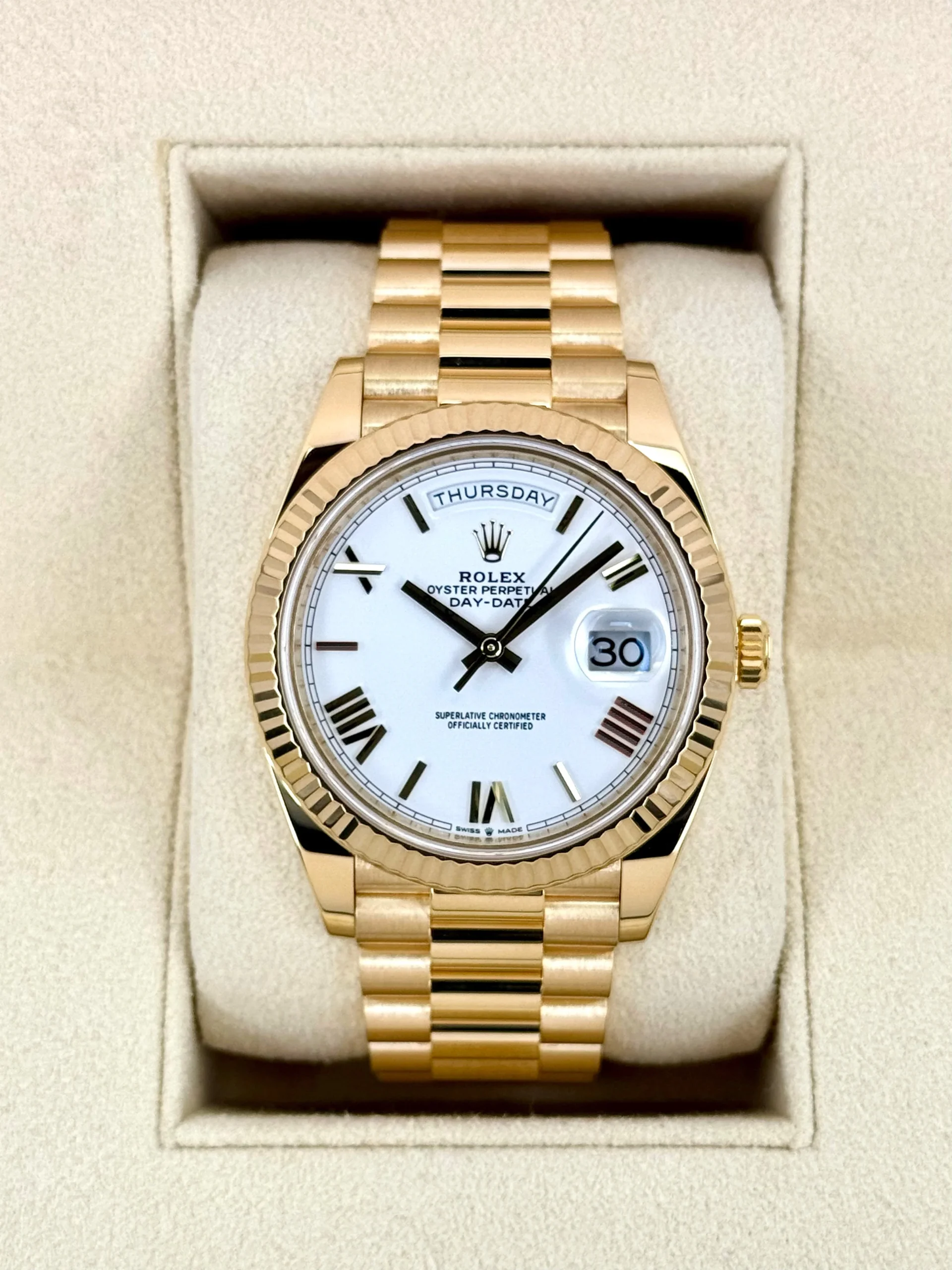 2023 Rolex Day-Date 40mm 228238 18K Yellow Gold Presidential Bracelet White Dial