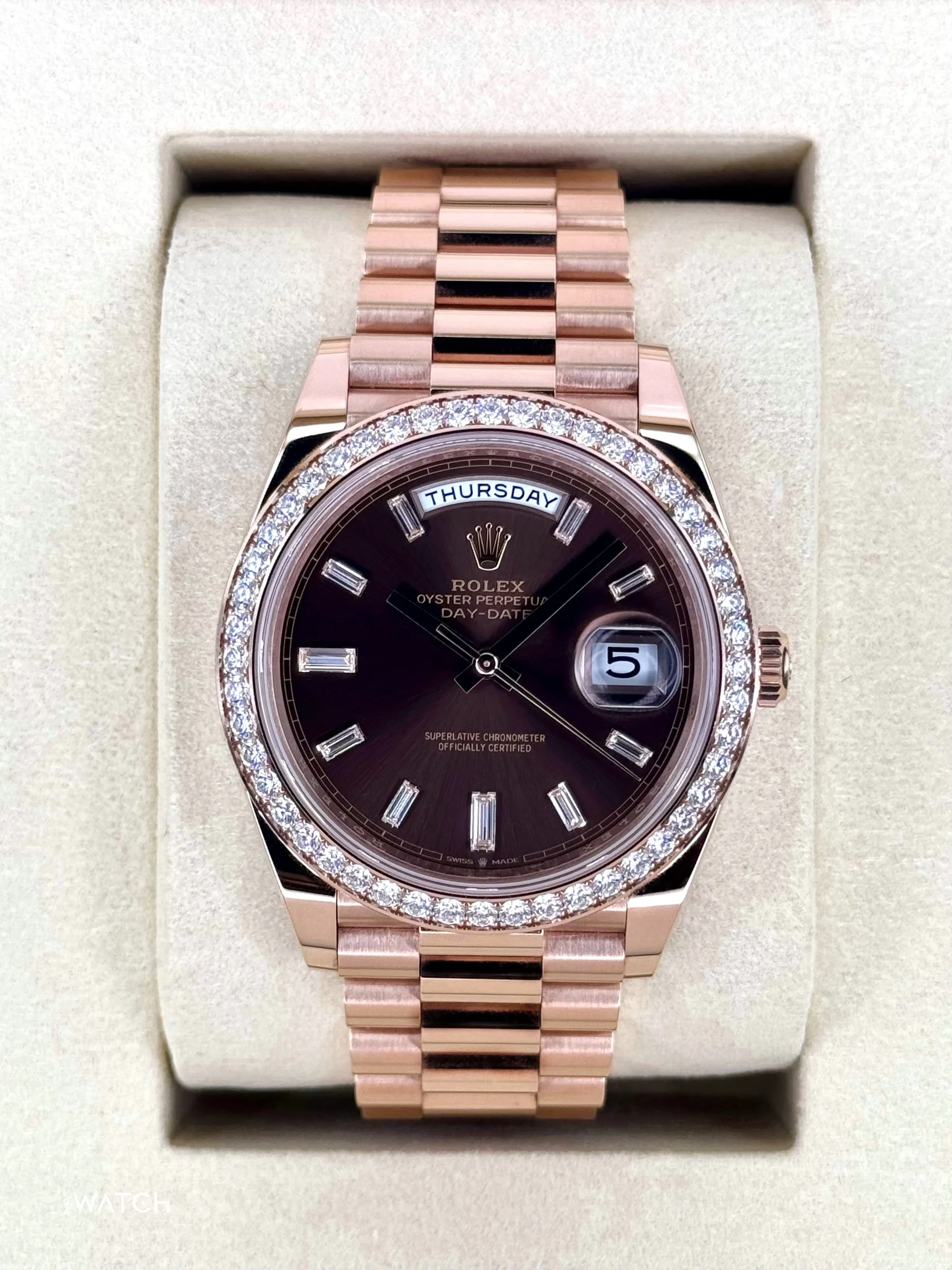 2025 Rolex Day-Date 40mm 228345RBR Presidential Bracelet 18kt Everose Gold with Diamond Set Bezel and Chocolate Diamond Baguette Dial