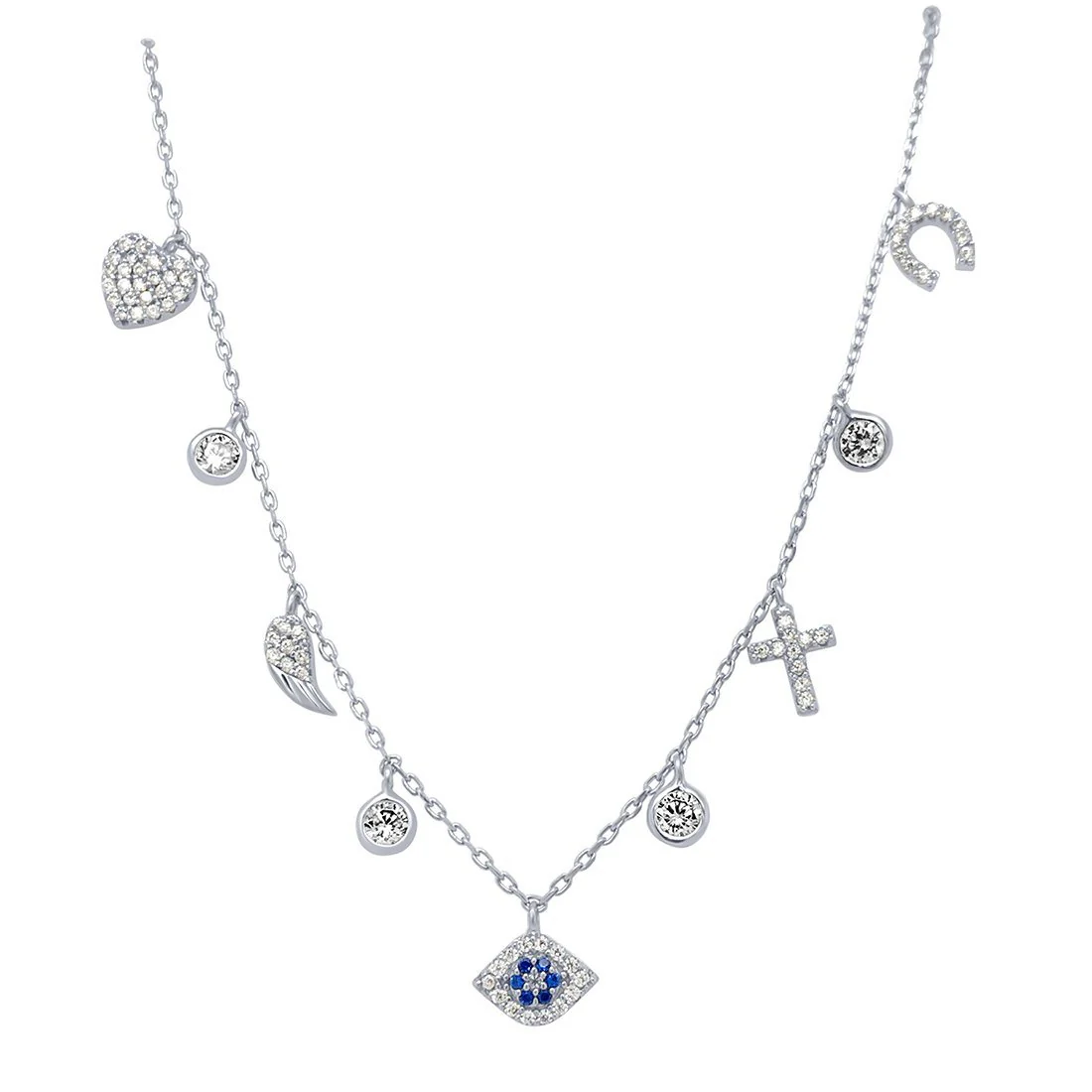 On trend, highly sought and making a comeback, are chokers. This Sterling Silver Choker features 9 cubic zirconias charms on a 35cm 5cm chain. Charms include, heart, angel wing, evil eye, cross and horseshoe.