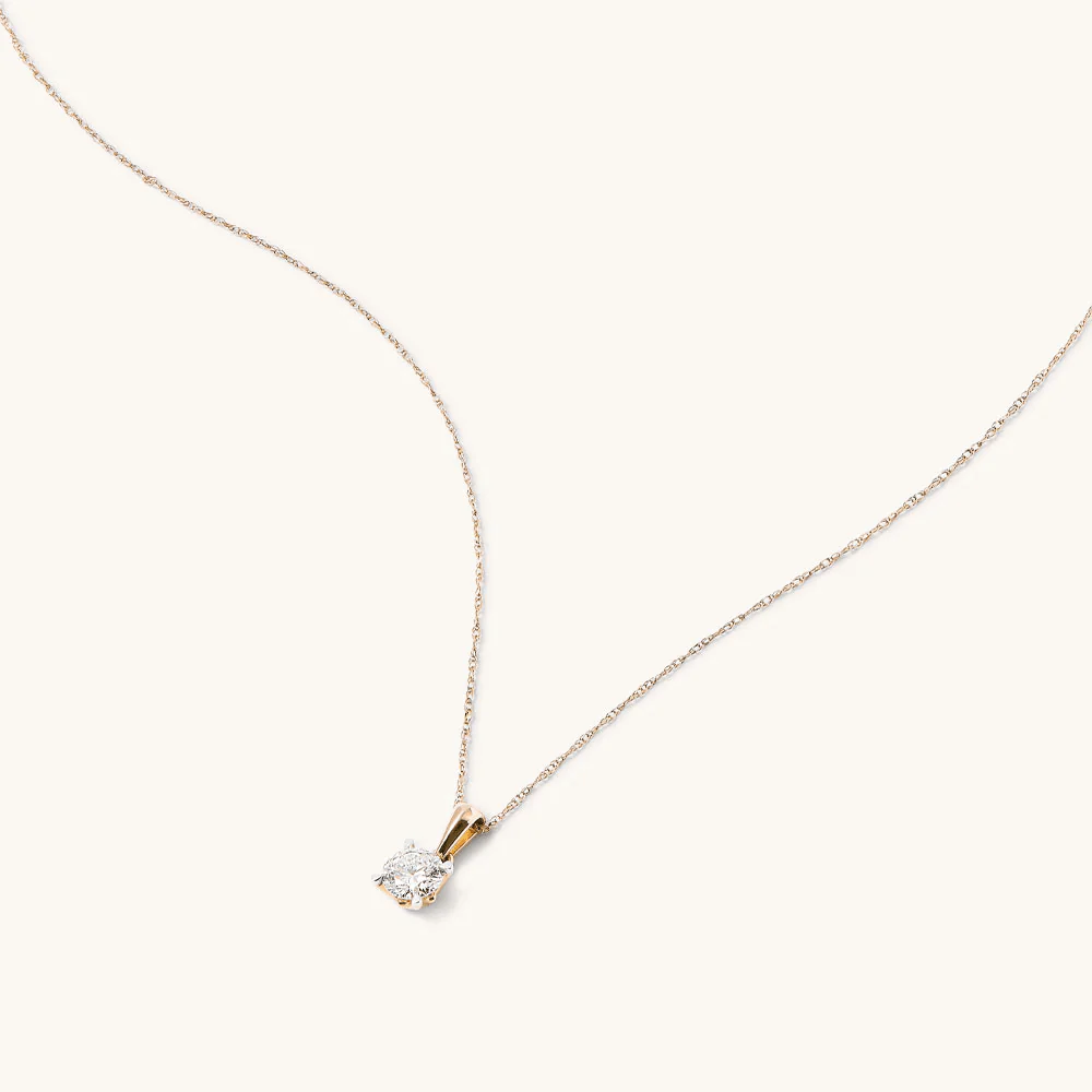 Exude modern elegance with this 0.50ct total weight laboratory-grown diamond solitaire necklace in 9kt yellow gold. Gracefully suspended from a 45cm 1mm rope chain, this necklace features a sparkling claw set round brilliant solitaire laboratory-grown diamond of F+ colour and VS1 clarity. Perfect for layering and wearing individually, this solitaire necklace is the perfect piece to elevate your everyday look.