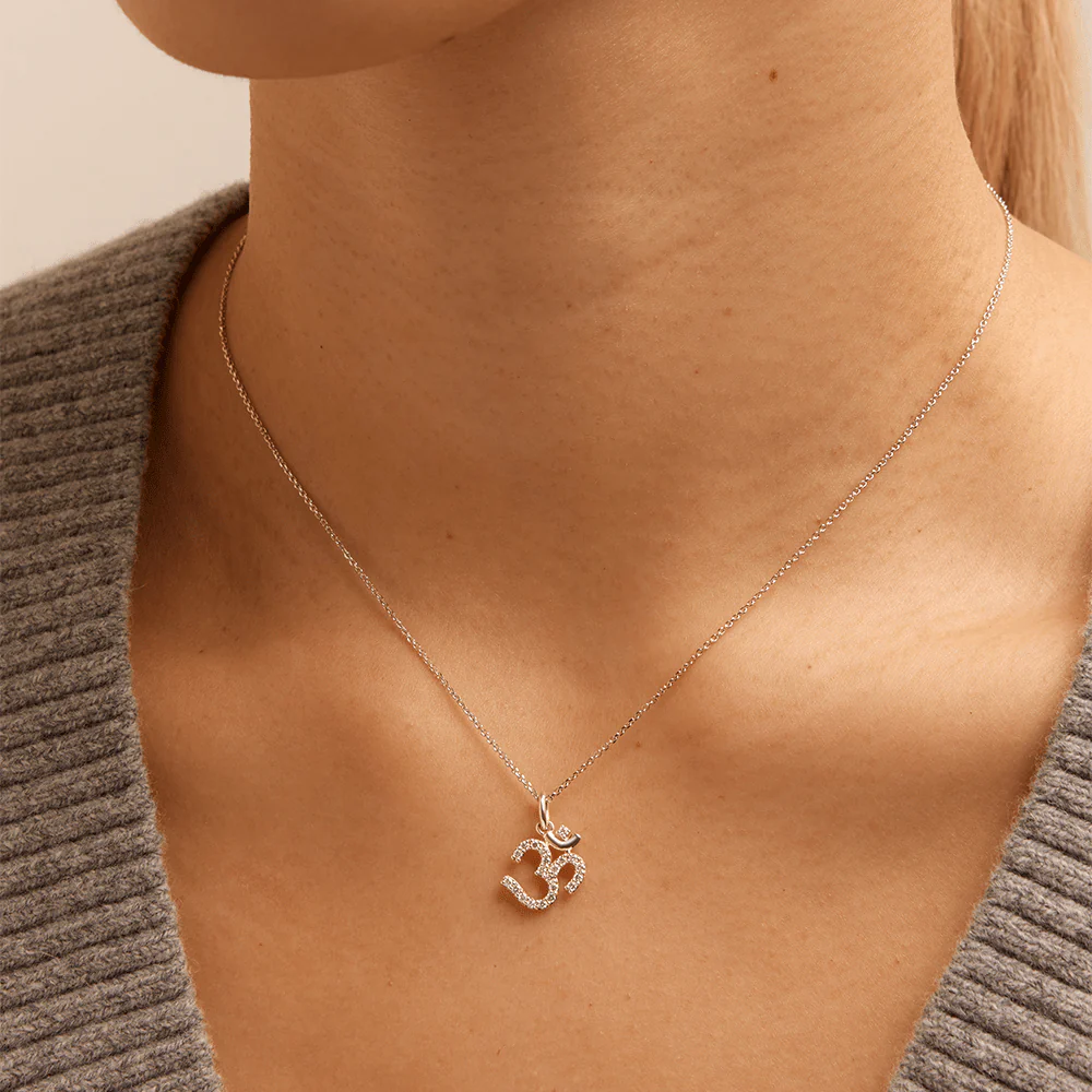 This beautiful aum necklace with 0.18ct total weight of laboratory-grown diamonds in sterling silver and platinum features the sacred Hindu symbol, adorned with round brilliant laboratory diamonds of G+ colour and SI2 clarity for a radiant finish. Suspended from a classic 1mm cable chain with an adjustable length of 40cm to 45cm, this meaningful 12mm by 16mm pendant necklace blends spiritual elegance with refined sparkle, perfect for everyday wear or gifting.