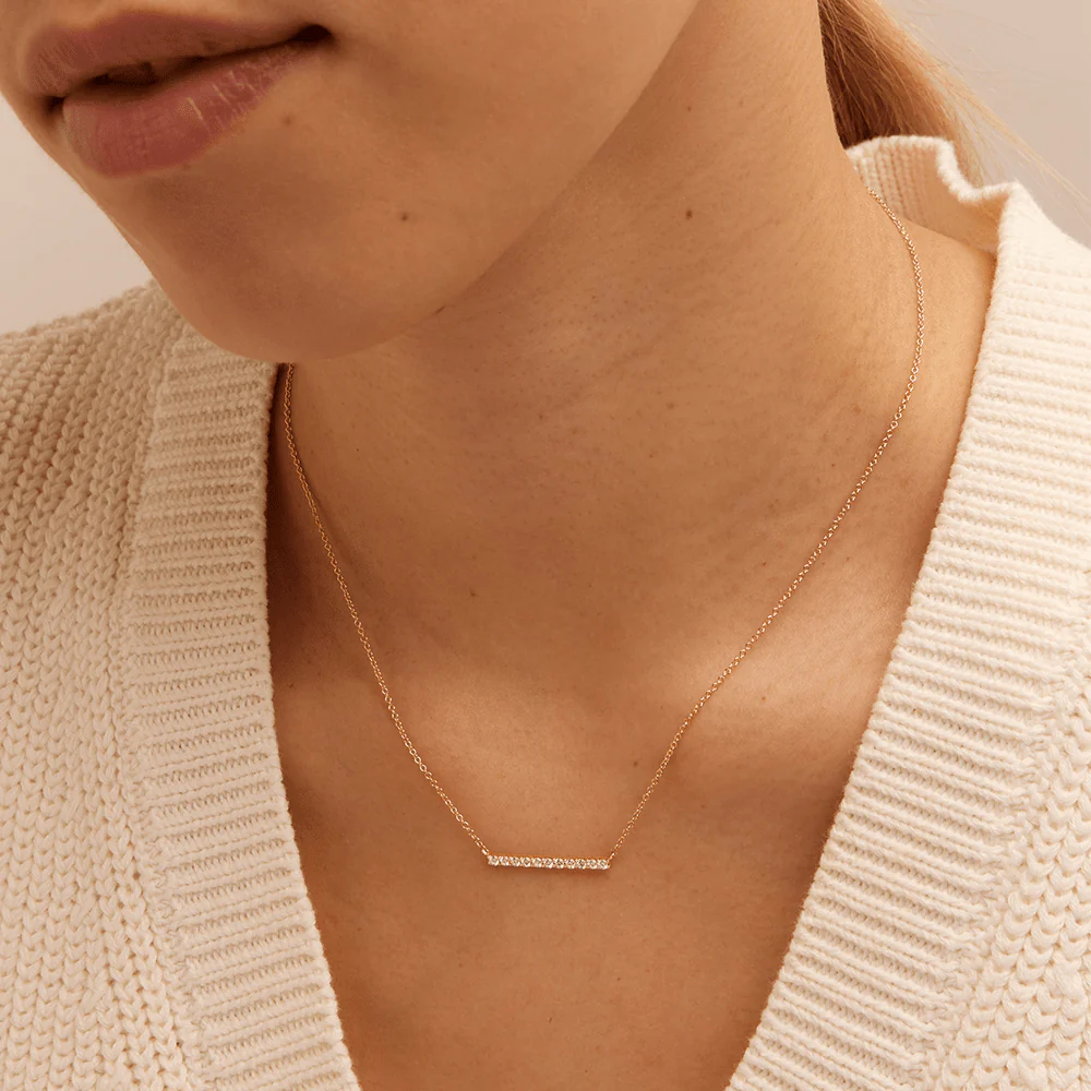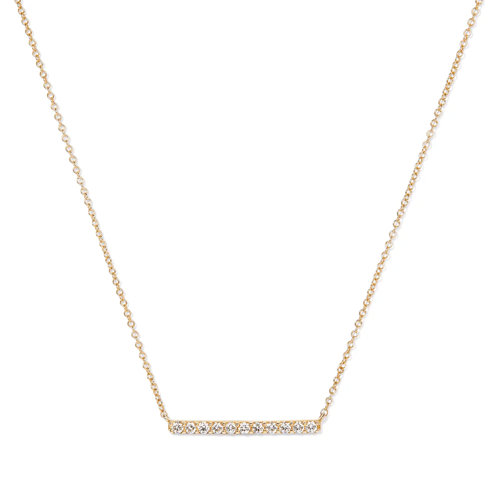 Discover effortless elegance with this refined 45cm bar necklace, featuring 0.26ct total weight of laboratory-grown diamonds in 9kt yellow gold. Suspended from a dainty 1mm cable chain, the sleek 2mm by 22mm bar design is adorned with round brilliant laboratory-grown diamonds of G+ colour and SI2 clarity. This dainty necklace has an extendable length of 40cm to 45cm, making it the perfect piece for layering or wearing solo—bringing a polished finish to your everyday style and making every moment feel luxurious.