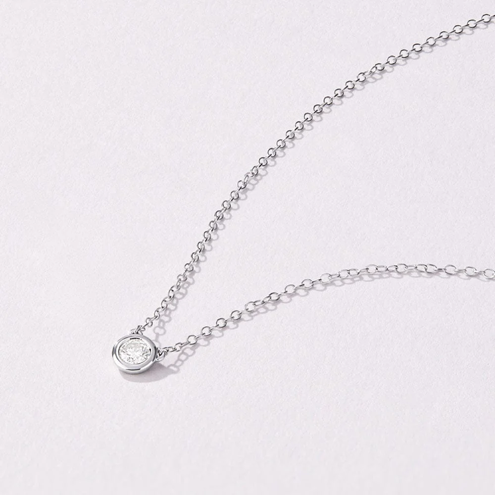 This timeless 45cm bezel set solitaire pendant necklace featuring 0.20ct total weight of laboratory-grown diamonds in sterling silver and platinum is the perfect piece to elevate your look. Set on a 1mm cable chain, this necklace features a 4.9mm bezel set round brilliant solitaire pendant of F colour and VS1 clarity. Whether styling as layering piece or wearing individually, this necklace is sure to complement your look perfectly.