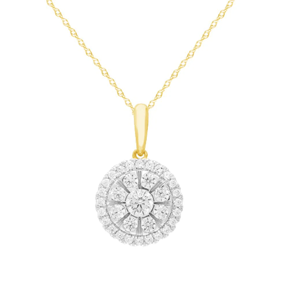This lovely Halo Necklace with 0.50ct total weight of Diamonds in 9kt Yellow Gold features a halo setting. Crafted in 9kt yellow gold, this piece exudes understated luxury with a radiant warmth that complements every skin tone.