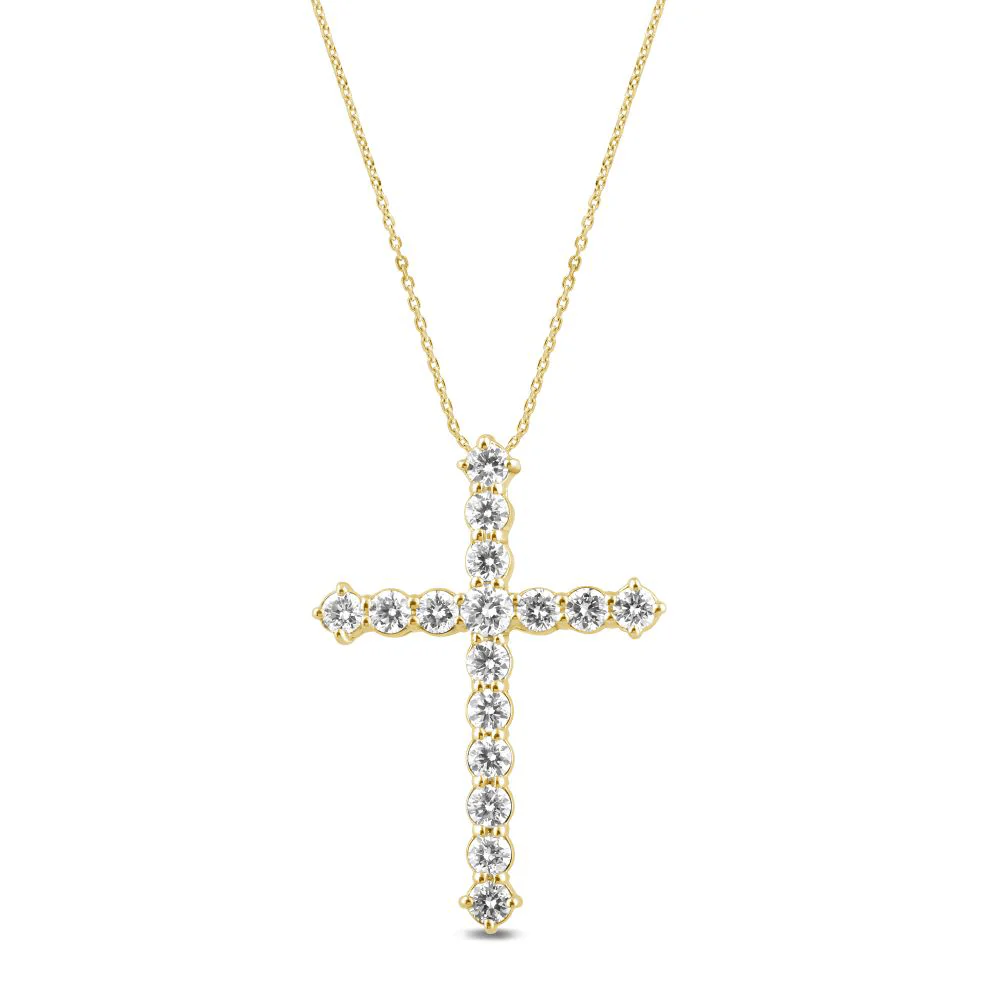 A stylish and graceful expression of faith, this 45cm cross necklace features 0.50ct total weight of laboratory-grown diamonds in 9kt yellow gold. Set on a 1mm rope chain, this necklace features a beautiful 15mm by 22mm cross pendant, claw set with round brilliant laboratory-grown diamonds of F+ colour and VS2 clarity. The perfect choice for a thoughtful gift or a personal keepsake, this cross necklace will ensure you shine bright day and night.