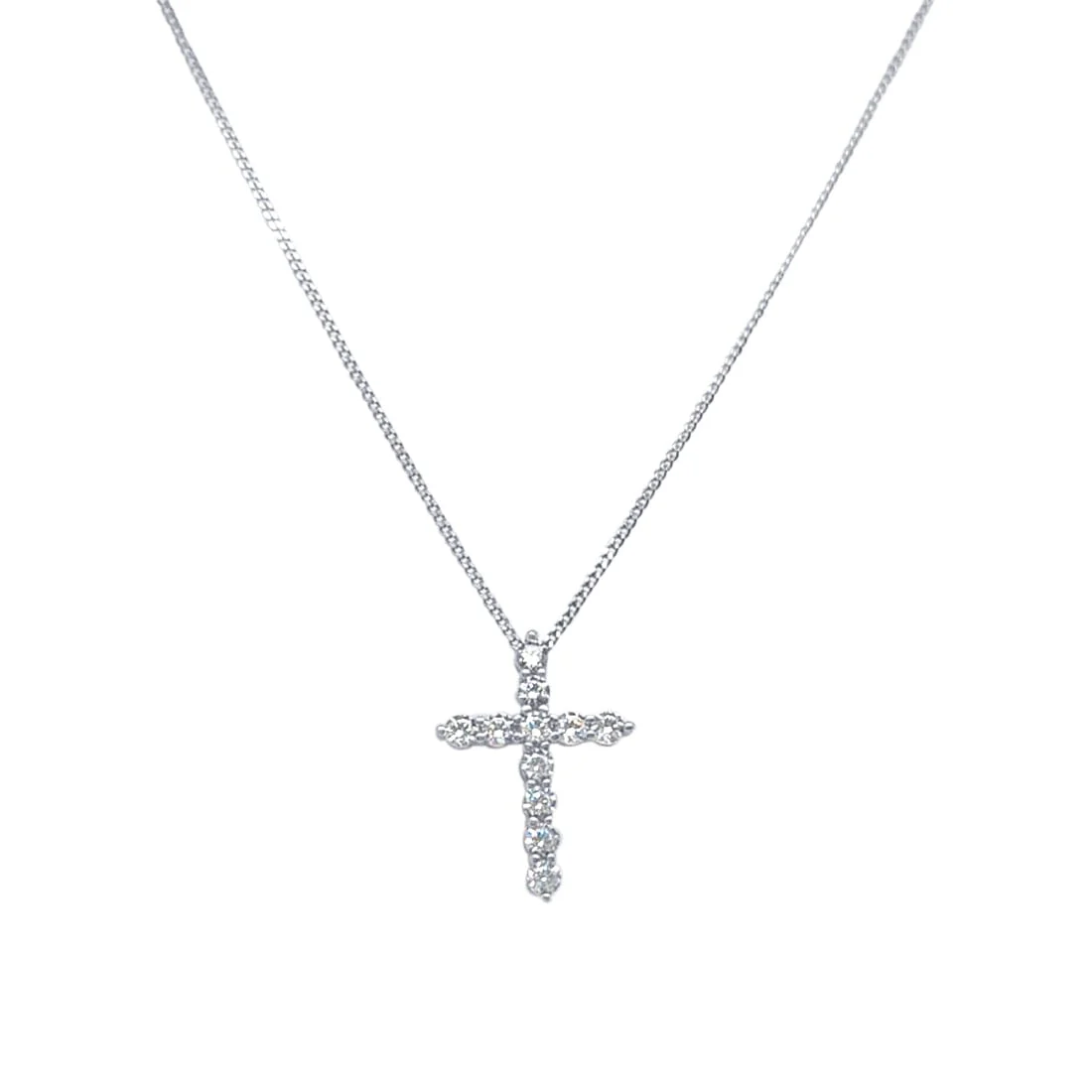 This is a Cross Necklace with Cubic Zirconia in Sterling Silver. This classic religious design features a hidden bale, and cubic zirconia stones throughout. This cross is 21mm long.