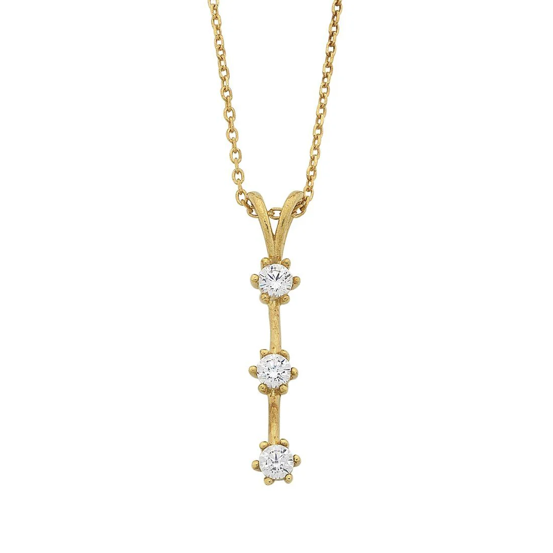 A piece to accelerate your style is this stunning 9kt Yellow Gold Silver Infused Necklace. This piece features three Cubic Zirconia on a drop bar design.