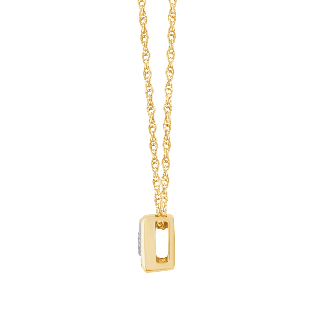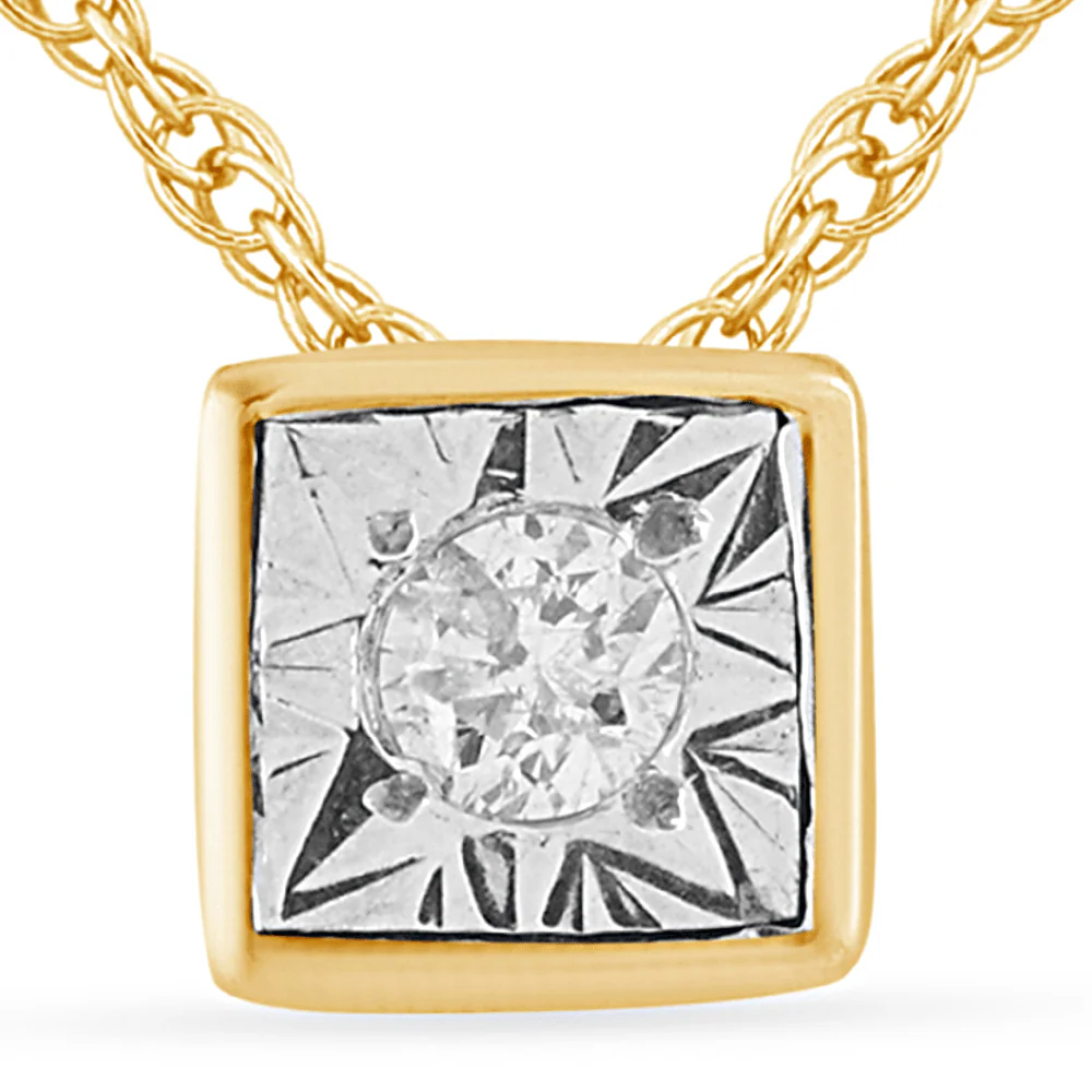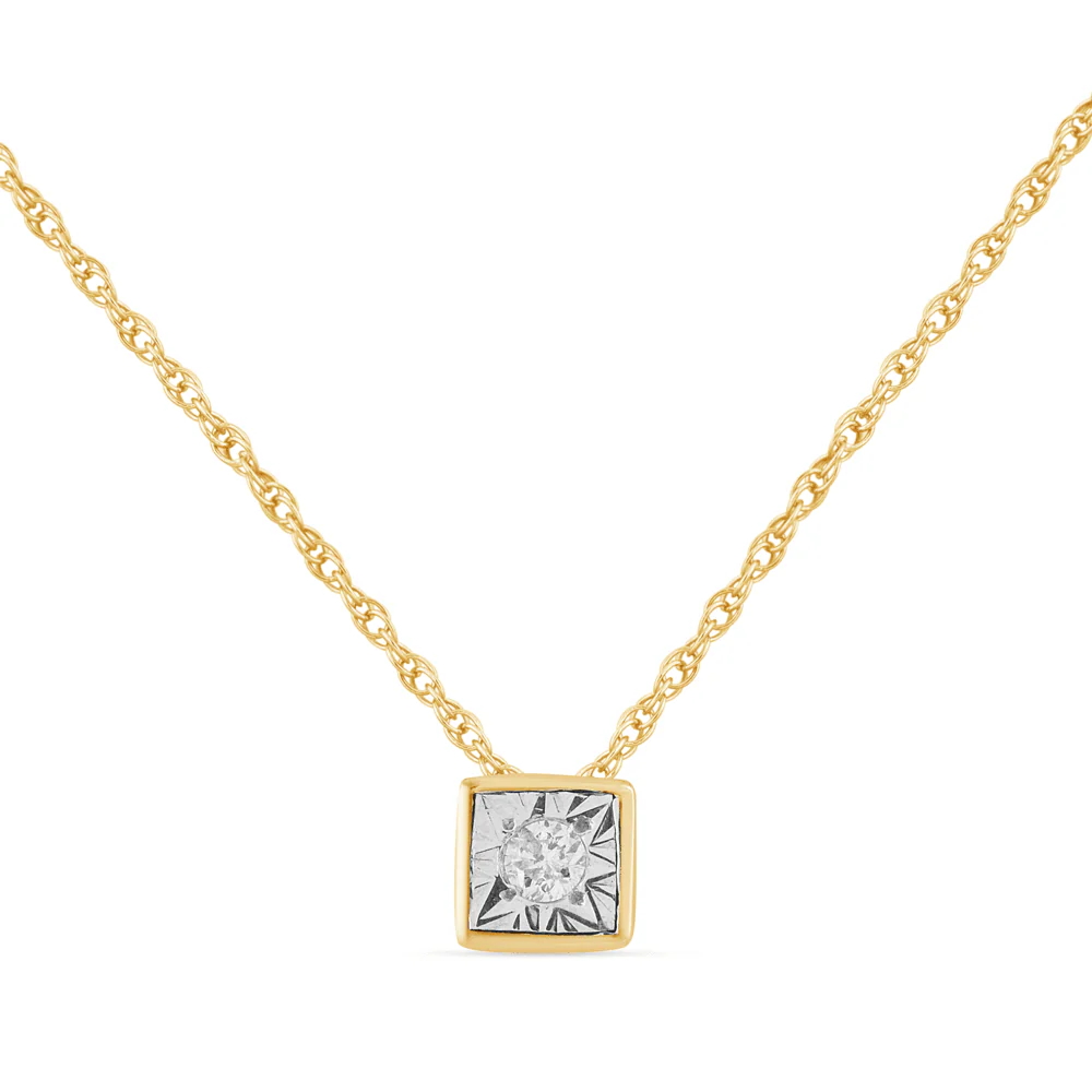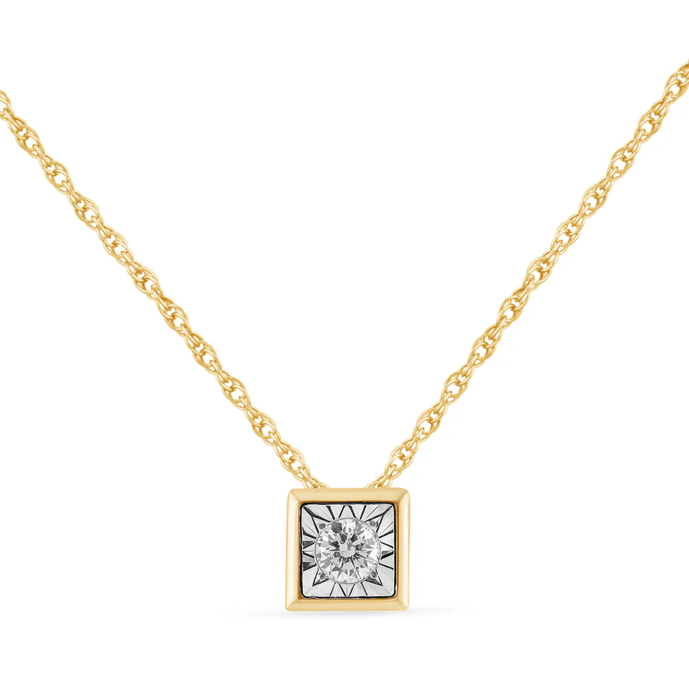 This 45cm diamond set bezel cushion necklace in 9kt yellow gold features a classic cushion design, miracle set with a round solitaire diamond of HI colour and SI2 clarity, weighing 0.02ct. Set on a 1mm rope chain, this necklace showcases a 4mm bezel cushion pendant, making it the perfect piece for layering or wearing solo. Whether chosen as a gifting piece or a personal keepsake, this necklace is designed to ensure timeless style.