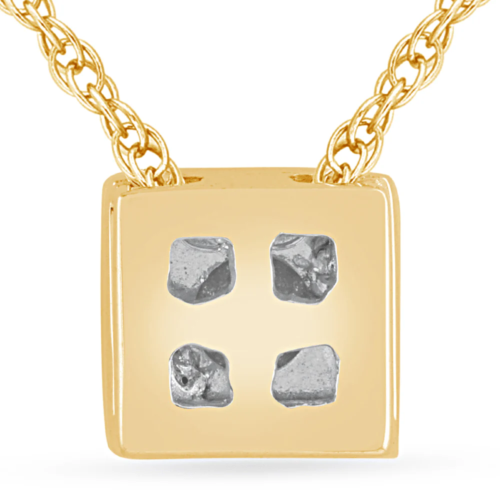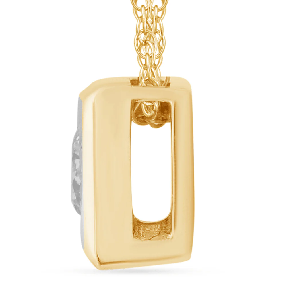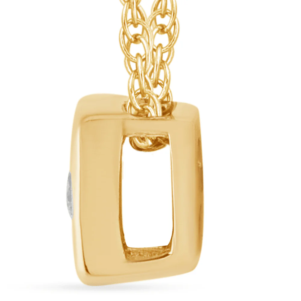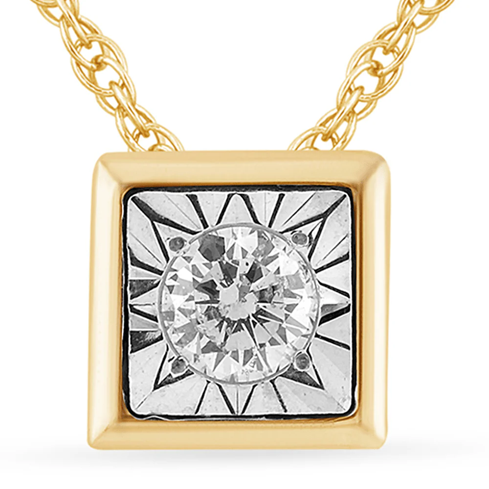 This 45cm diamond set bezel cushion necklace in 9kt yellow gold features a classic cushion design, miracle set with a round solitaire diamond of HI colour and SI2 clarity, weighing 0.02ct. Set on a 1mm rope chain, this necklace showcases a 4mm bezel cushion pendant, making it the perfect piece for layering or wearing solo. Whether chosen as a gifting piece or a personal keepsake, this necklace is designed to ensure timeless style.