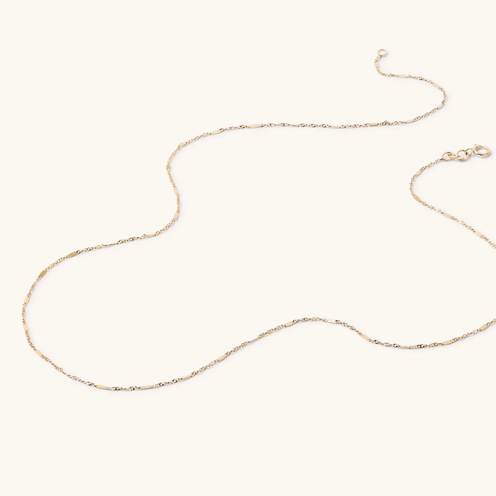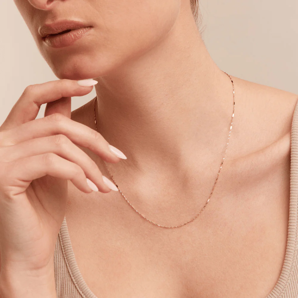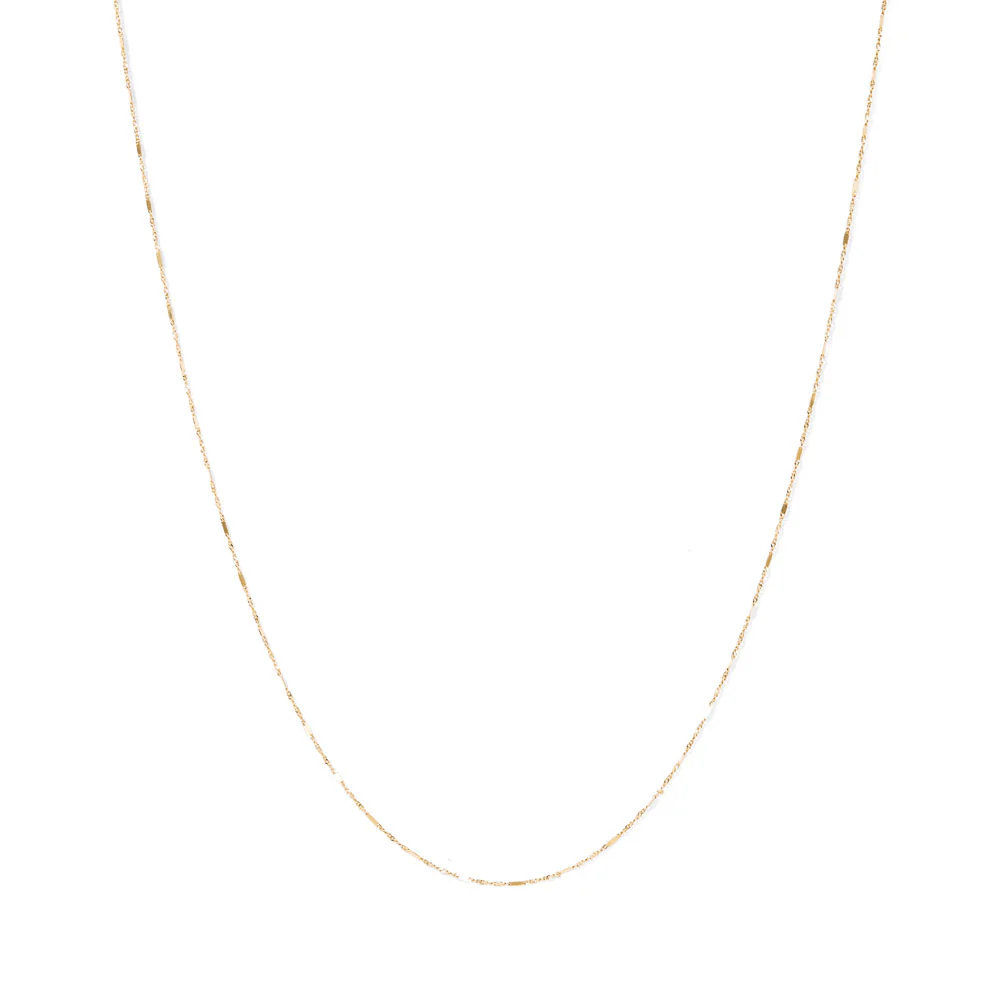 This 45cm faceted Singapore chain is crafted in 9kt yellow gold and features sleek rectangular facets that catch the light beautifully. Its intricate, twisted design adds a touch of sparkle.