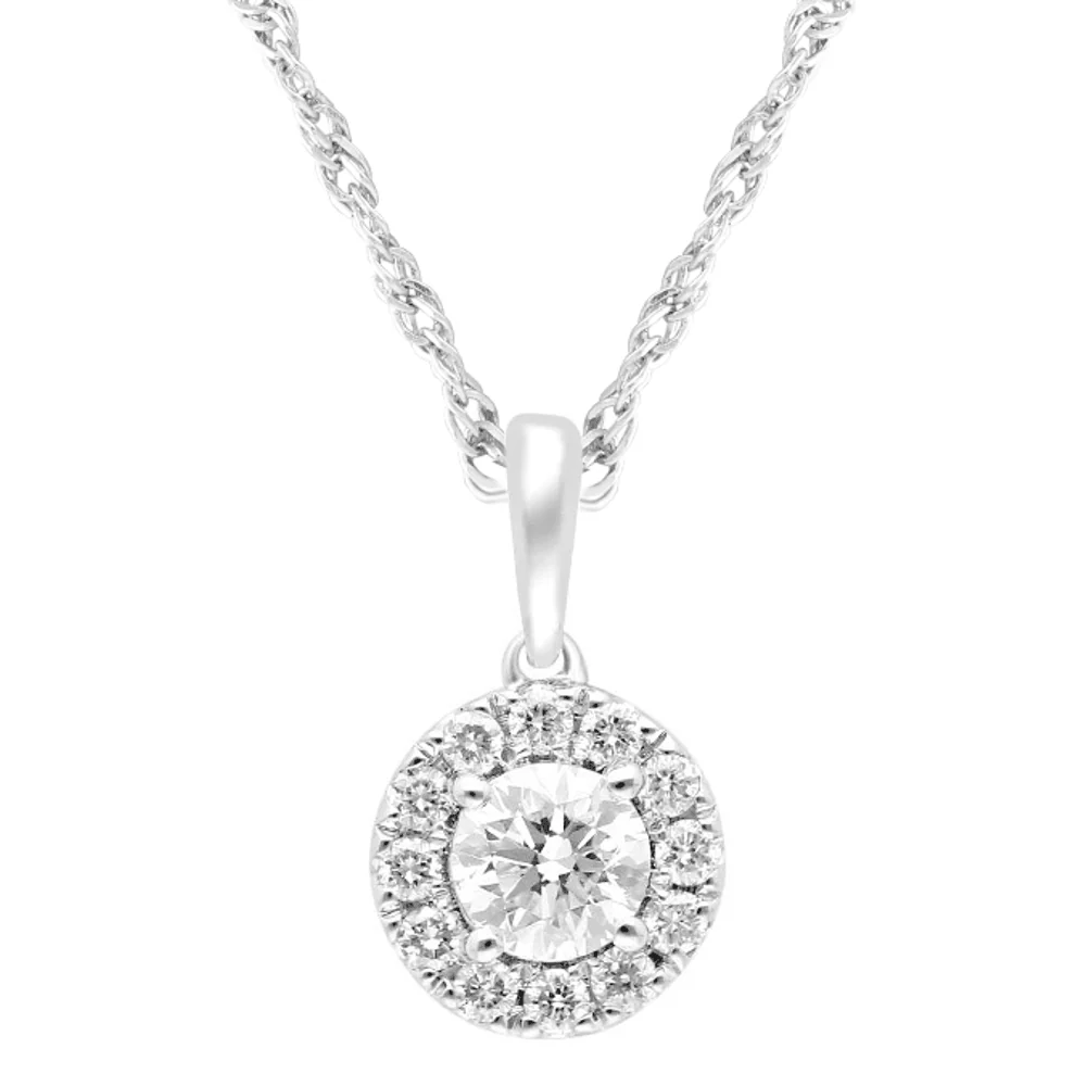 This exquisite 45cm Halo Solitaire Pendant Necklace, featuring 0.25ct total weight of Laboratory-Grown Diamonds in Sterling Silver and Platinum is a timeless jewellery essential. Suspended from a 1mm rope chain, this necklace features a stunning 7mm by 12mm halo bail pendant, claw set with round brilliant laboratory-grown diamonds of F+ colour and VS1 clarity. Whether styling as layering piece or wearing individually, this necklace is sure to complement your everyday and elevated look perfectly. Perfect as a gifting piece or a personal keepsake, this halo necklace was designed to ensure timeless style.