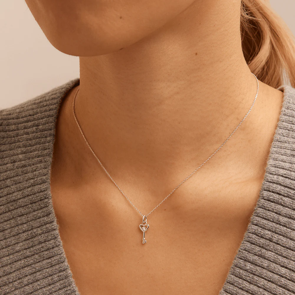 This dainty 45cm heart key pendant necklace features 0.01ct total weight of laboratory-grown diamonds in sterling silver and platinum. Showcasing a whimsical 6mm by 17mm heart-shaped key motif, with a claw set round brilliant solitaire laboratory diamond of G+ colour and SI2 clarity, this necklace symbolises love and new beginnings. Suspended from a 1mm extendable 40cm to 45cm cable chain, this heart key necklace is perfect for layering or wearing solo.