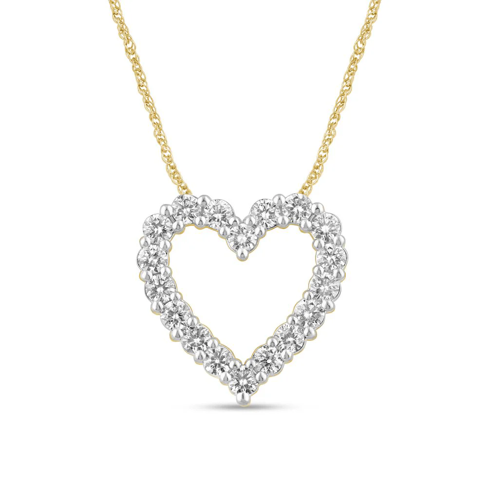 Modern design meets classic romance with this 45cm heart slider necklace, featuring 1.00ct total weight of laboratory-grown diamonds in 9kt yellow gold. Suspended from a 1mm rope chain, this necklace features a gorgeous 17mm open heart pendant, claw set with round brilliant laboratory-grown diamonds of F+ colour and VS1 clarity. The perfect choice for gifting or as a personal keepsake, this heart necklace is sure to become an everyday staple.