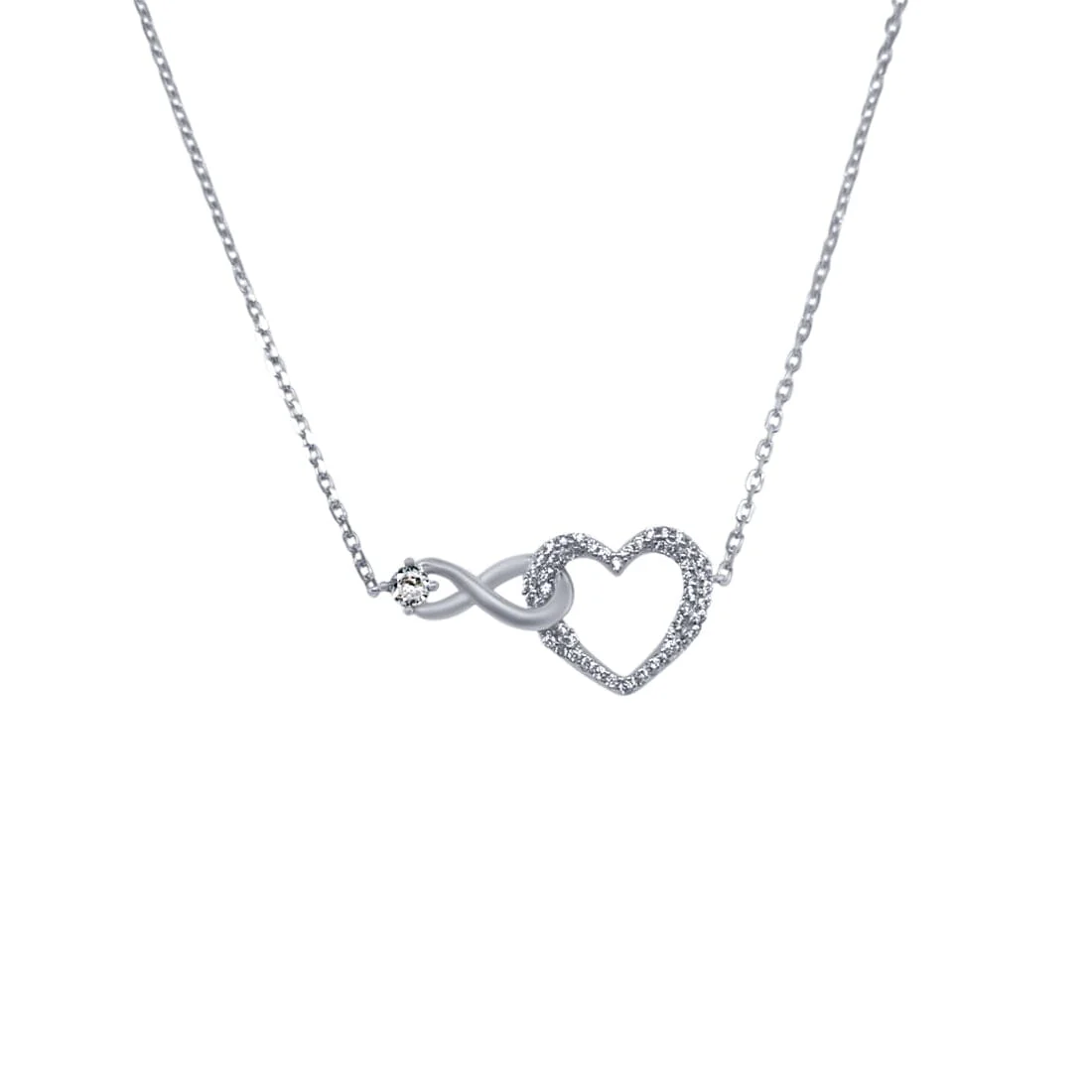 This gorgeous 45cm Infinity and Heart Necklace with Cubic Zirconia in Sterling Silver features claw settings. Elegant and timeless, a pendant necklace can be a subtle accessory, a complementing design piece or a standout showcase designed to embellish your look it all depends on how you tailor your outfit around it.