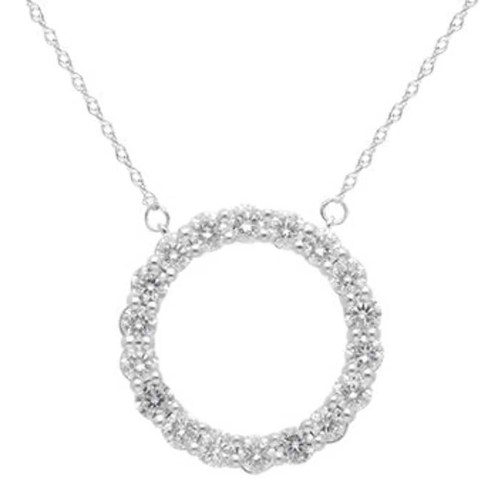 Exude modern elegance with this gorgeous 45cm open circle pendant necklace featuring 1.00ct total weight of laboratory-grown diamonds in sterling silver and platinum. Set on a 1mm rope chain, this necklace features a sleek 17mm open circle pendant, claw set with round brilliant laboratory-grown diamonds of F colour and VS2 clarity. Whether styling as layering piece or wearing individually, this necklace is sure to complement your look perfectly.