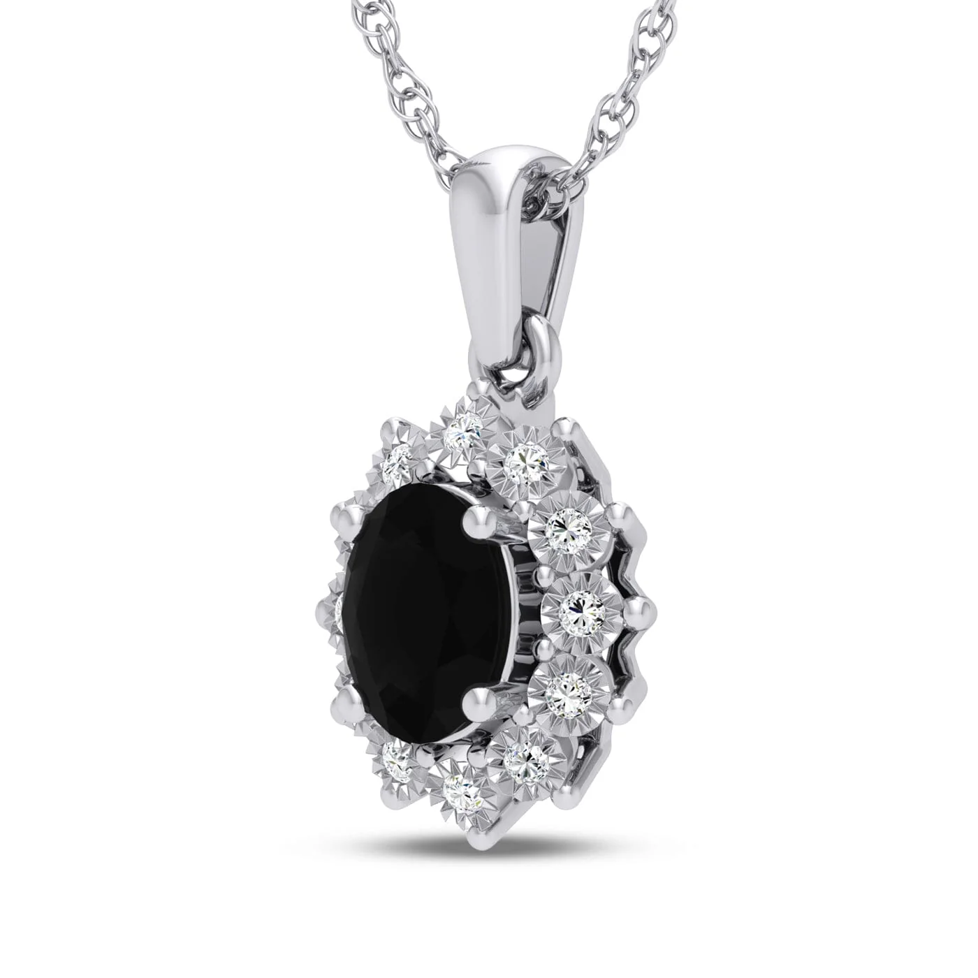 Glamorous and vibrant, this 45cm created sapphire and diamond halo flower necklace in sterling silver is the perfect piece for adding a sophisticated pop of colour to your look. Suspended from a 1mm rope chain, this necklace features an eye catching 11mm by 20mm halo flower design, showcasing an oval cut created sapphire centre stone surrounded by illusion set round brilliant diamonds of HI colour and I2 clarity, weighing 0.05ct. Whether gifting as a meaningful birthstone necklace or treating yourself to a personal keepsake, this necklace brings elegance and vibrancy to every look—day and night.