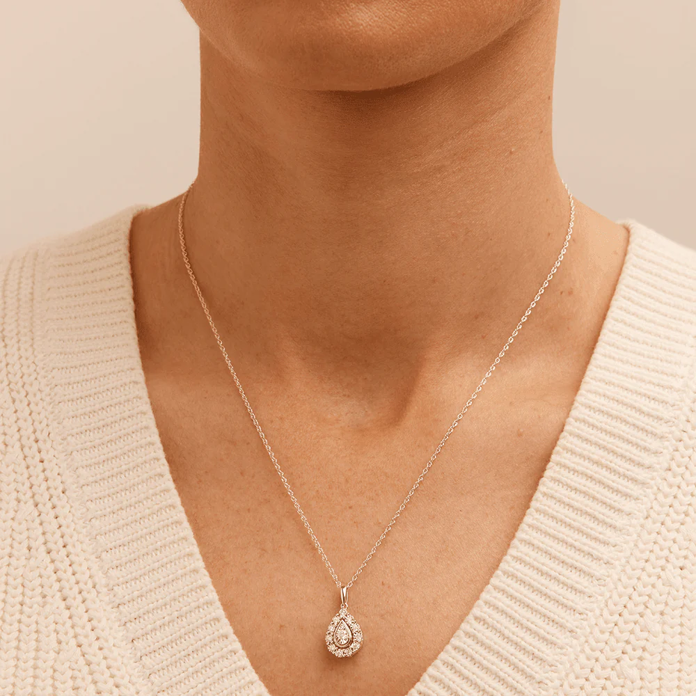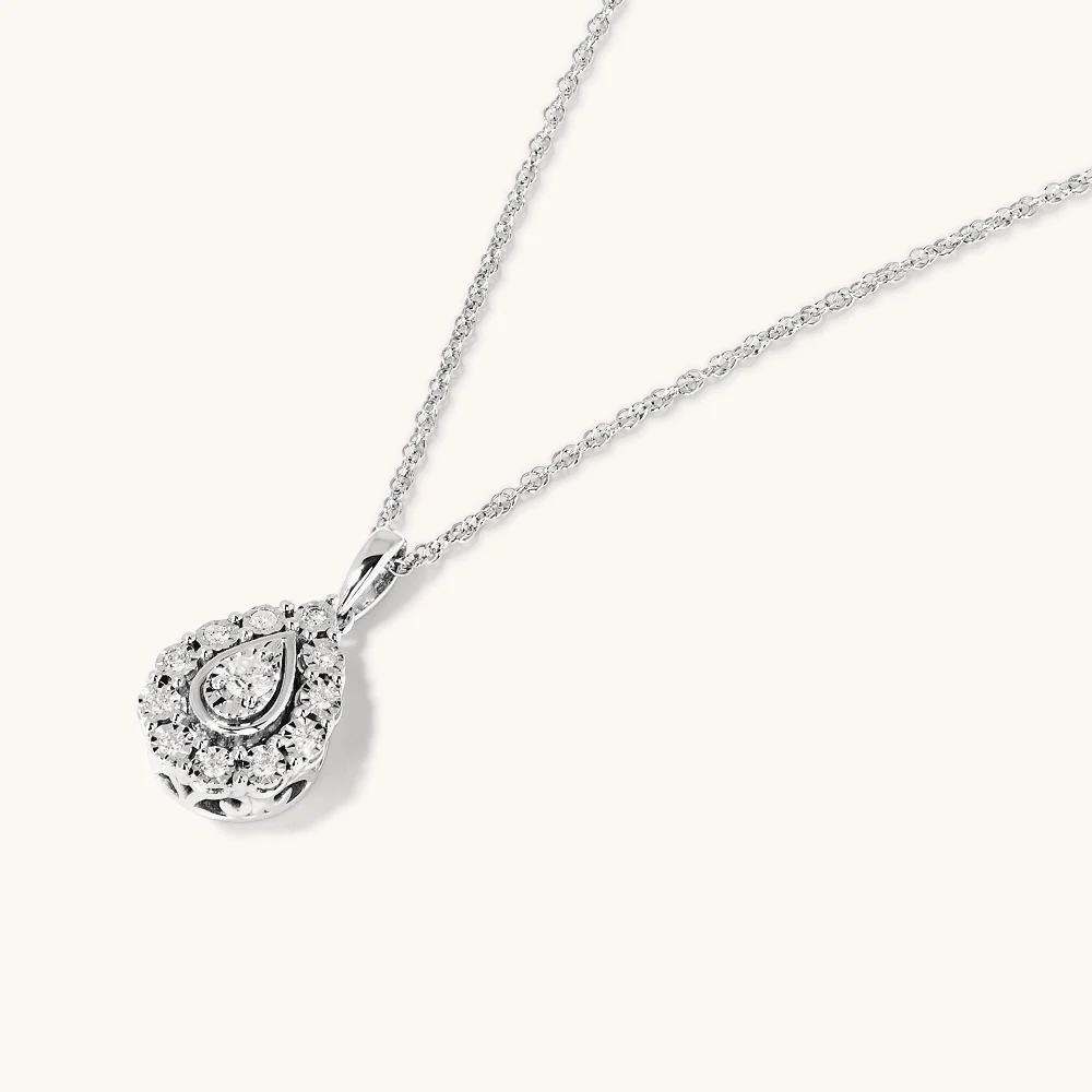 Obtain a timeless and elegant look with this 45cm pear shaped pendant necklace featuring 0.15ct total weight of diamonds in sterling silver and rhodium plating. Placed on a 45cm rope chain, this 10mm by 20mm pear shape halo pendant is miracle set with round brilliant diamonds of HI colour and I3 clarity, creating an elusive large diamond look. This necklace adds a graceful sparkle to every look, perfect for everyday wear and special occasions.