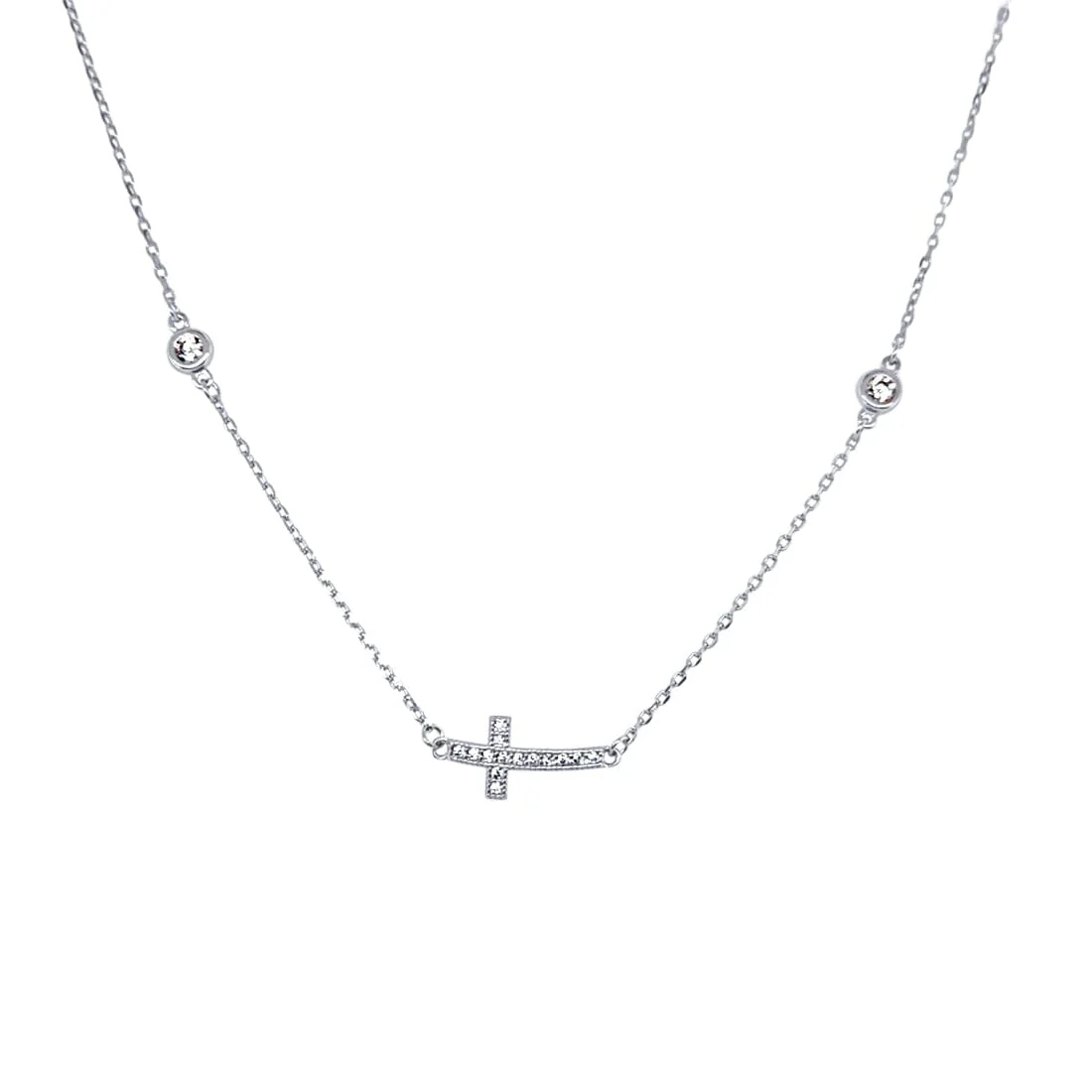 This Cross Necklace with Cubic Zirconia in Sterling Silver features a sideways cross design, with cubic zirconia stations as well.