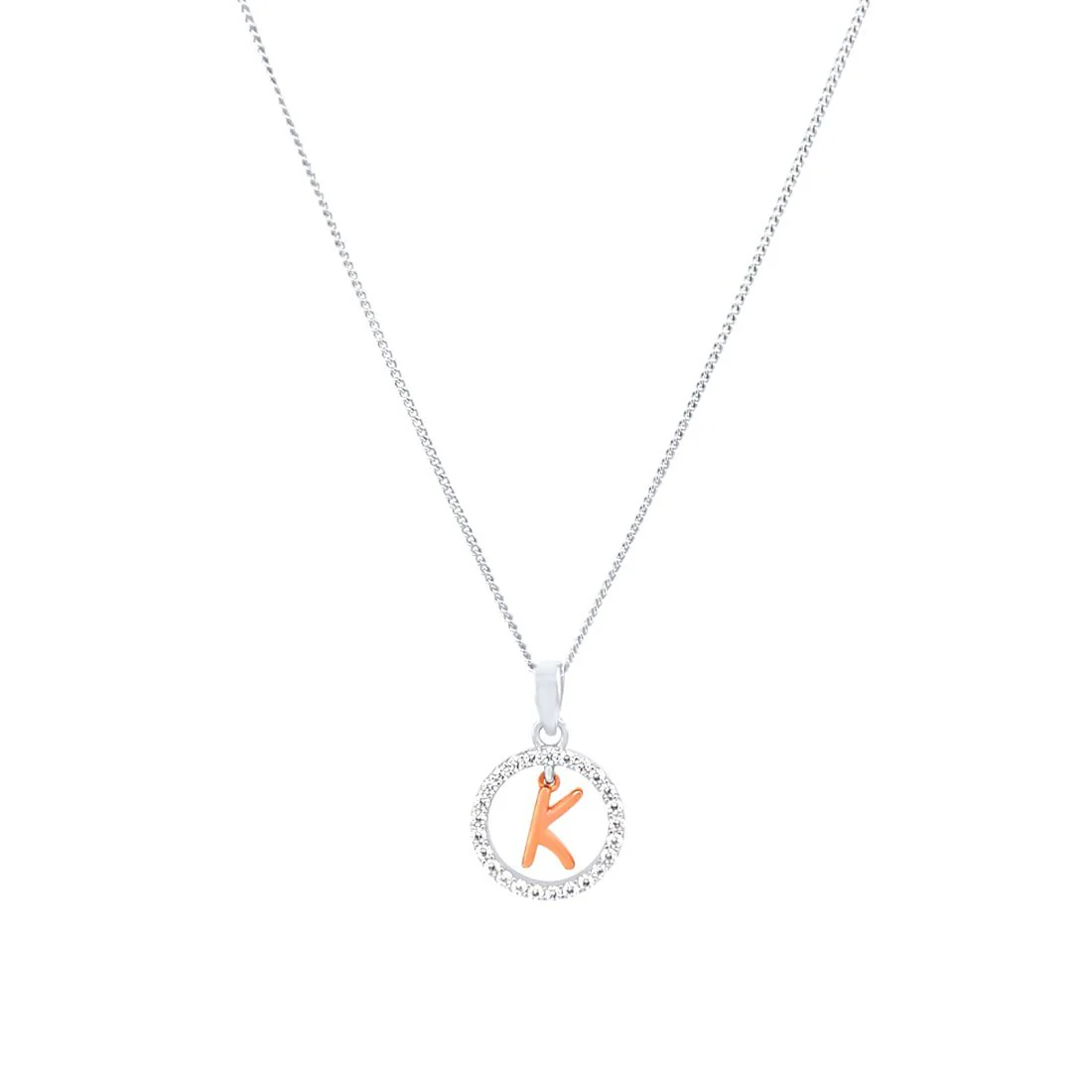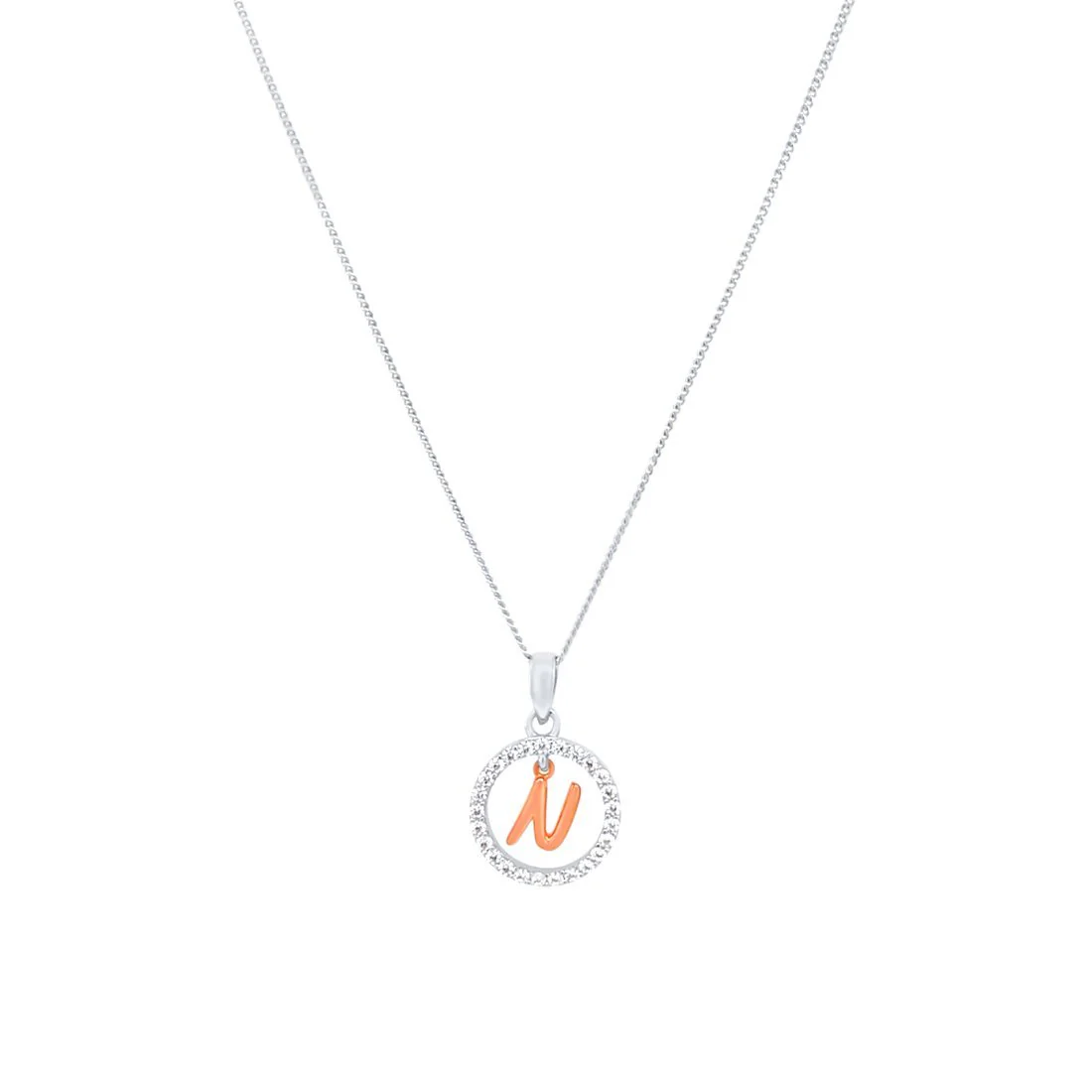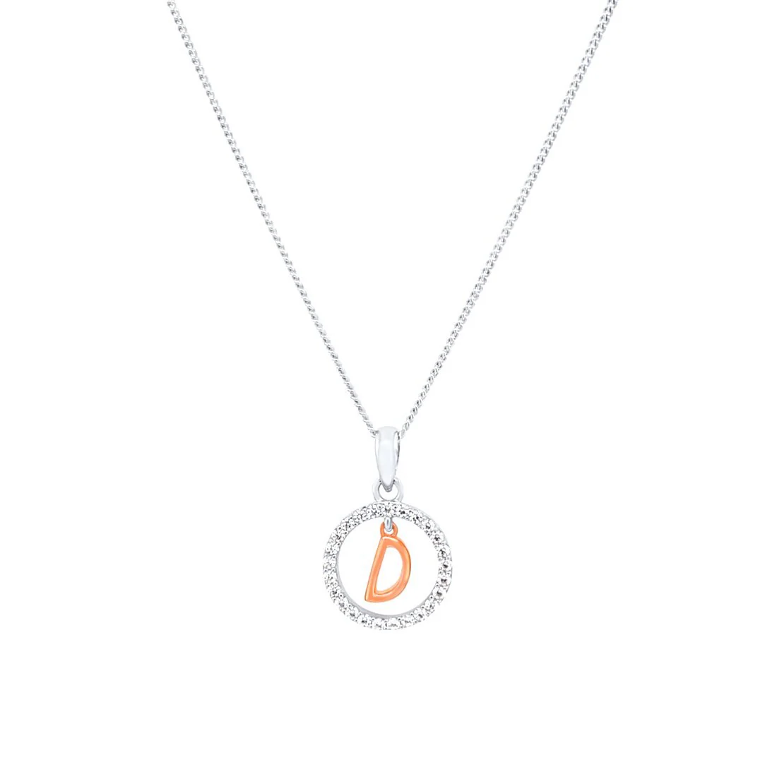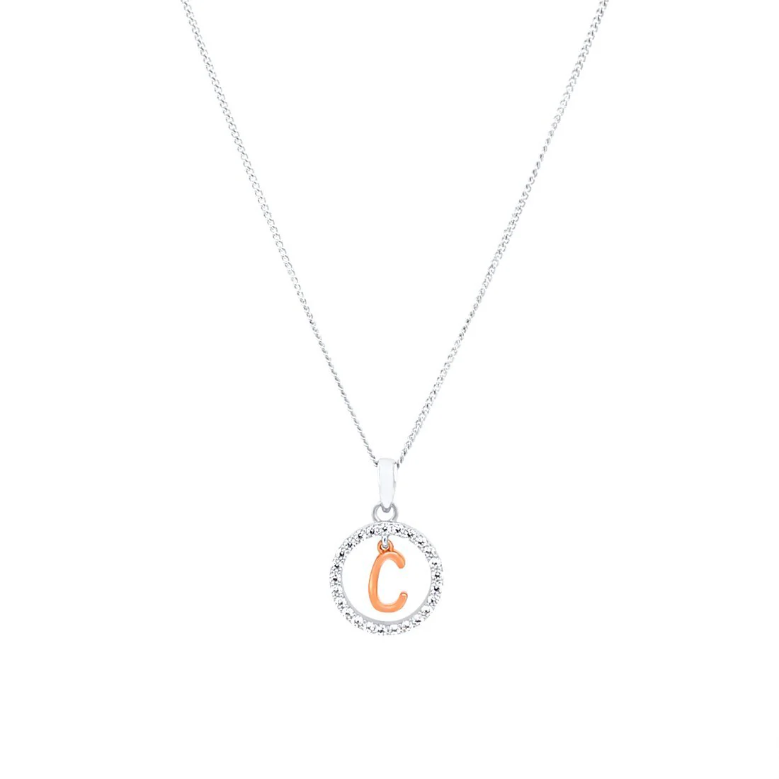 This Pendant Necklace features a beautiful open circle initial pendant, with cubic zirconias and a rose plated initial of your choice, on a 45cm chain,