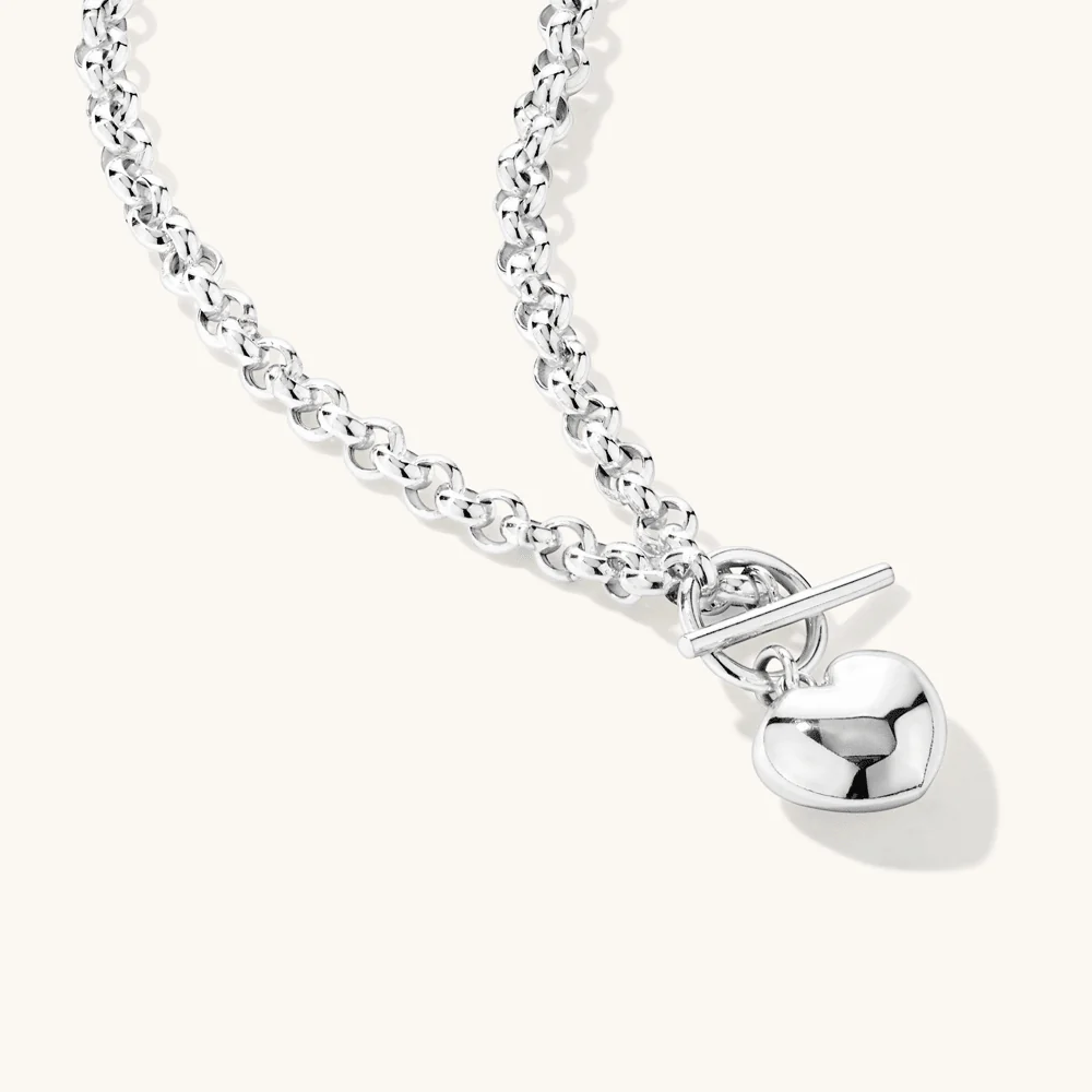 Exude modern elegance with this 45cm T-bar Heart Pendant Belcher Necklace in Sterling Silver. The 4mm belcher chain meets a T-bar clasp set with an elegant puffy heart charm, offering a refined silhouette perfect for layering or making a statement on its own. A staple addition to every jewellery collection, it balances classic elegance with contemporary edge.