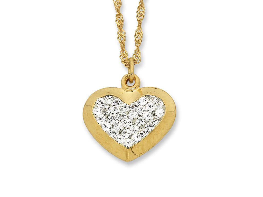 You deserve this 9kt Yellow Gold Silver Infused Crystal Heart Necklace on its sparking 45cm Singapore chain – why not indulge yourself with this unforgettable memento that celebrates love! The shimmering crystal filled heart has instant appeal and is sure to make you smile.