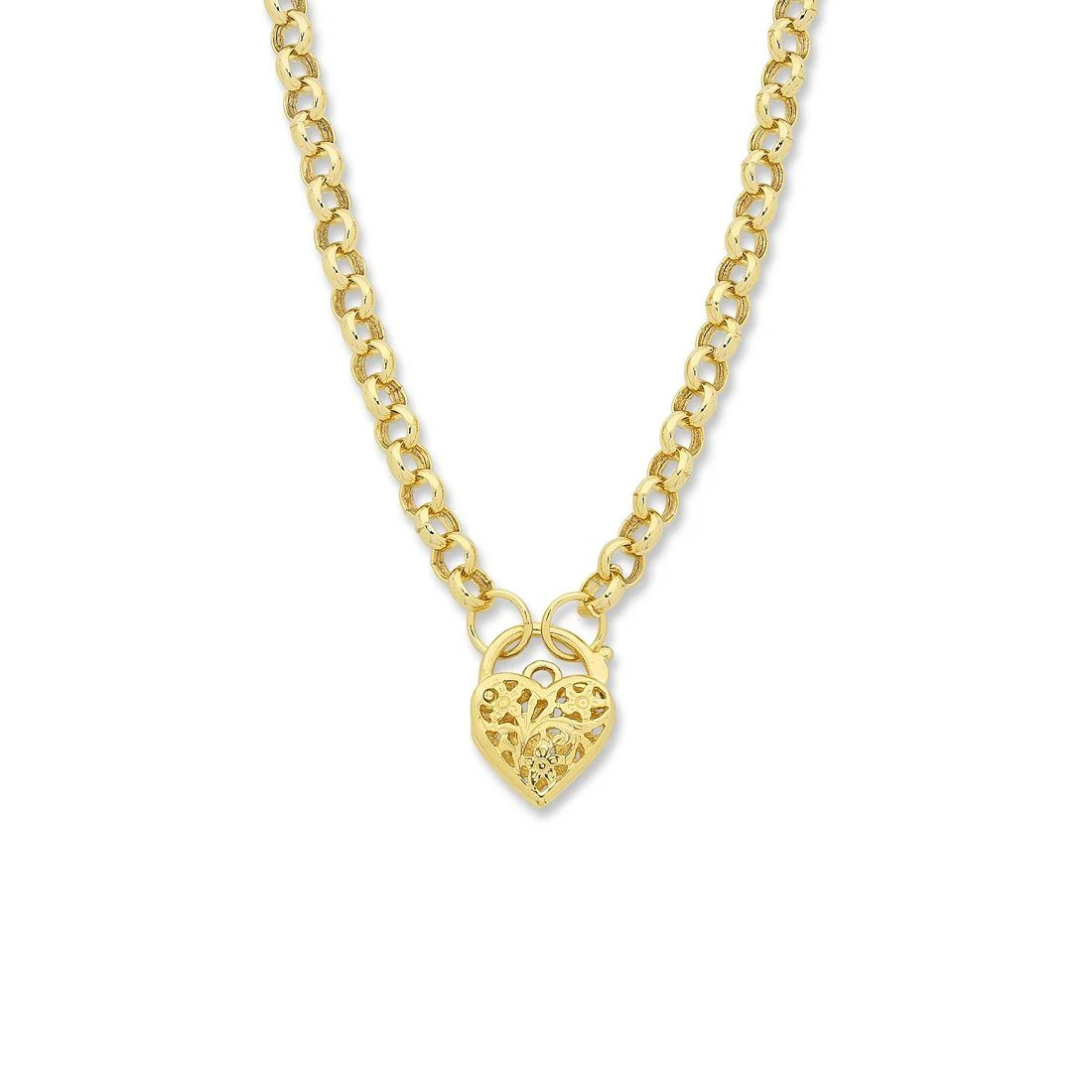 A true accent piece, this Yellow Gold Silver Infused Necklace delivers vintage charm with its elegant filigree design and heart shaped padlock pendant. A striking investment piece, this necklace is timeless and is the perfect piece to mark a special moment. This piece features belcher links in a 45cm chain.