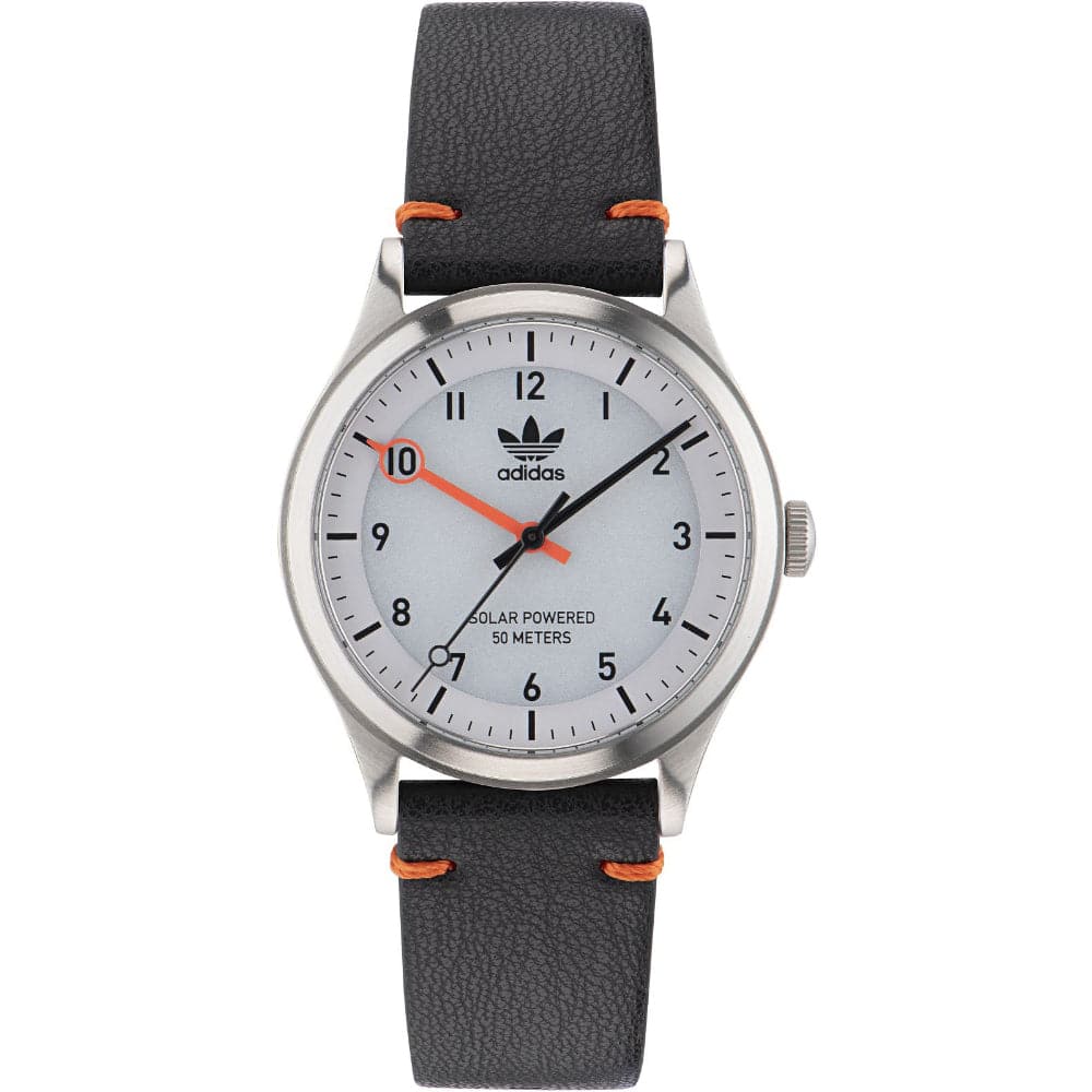 The adidas Originals Project One Solar AOST23045 watch features a silver stainless steel envelope, which sets a white, easy-to-read dial complemented by linear and Arabic numeral indexes. The dial is protected by mineral glass. Water resistance of 5 ATM class protects the watch in case of a major splash. The whole is complemented by a black leather strap. The model bases its operation on a solar mechanism.