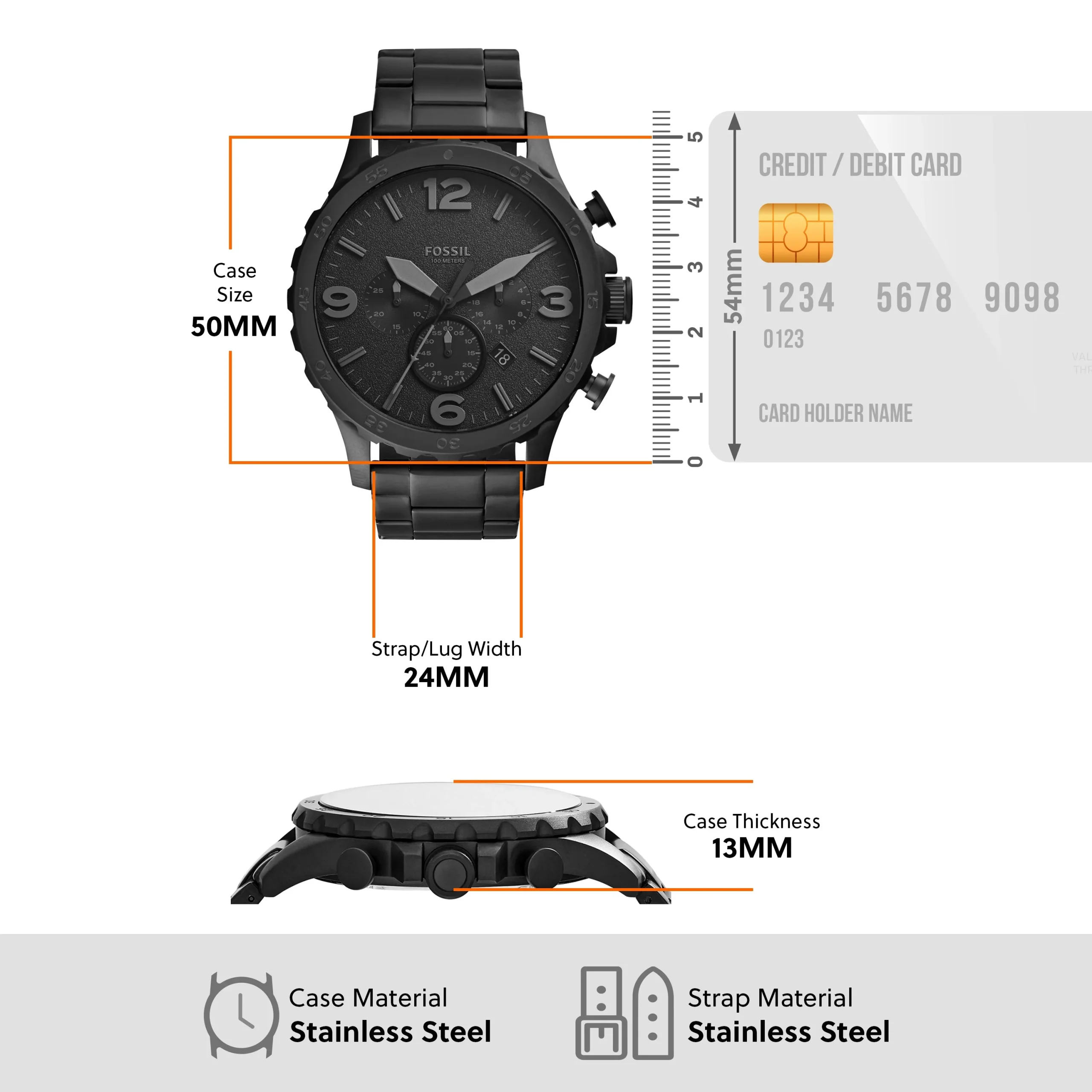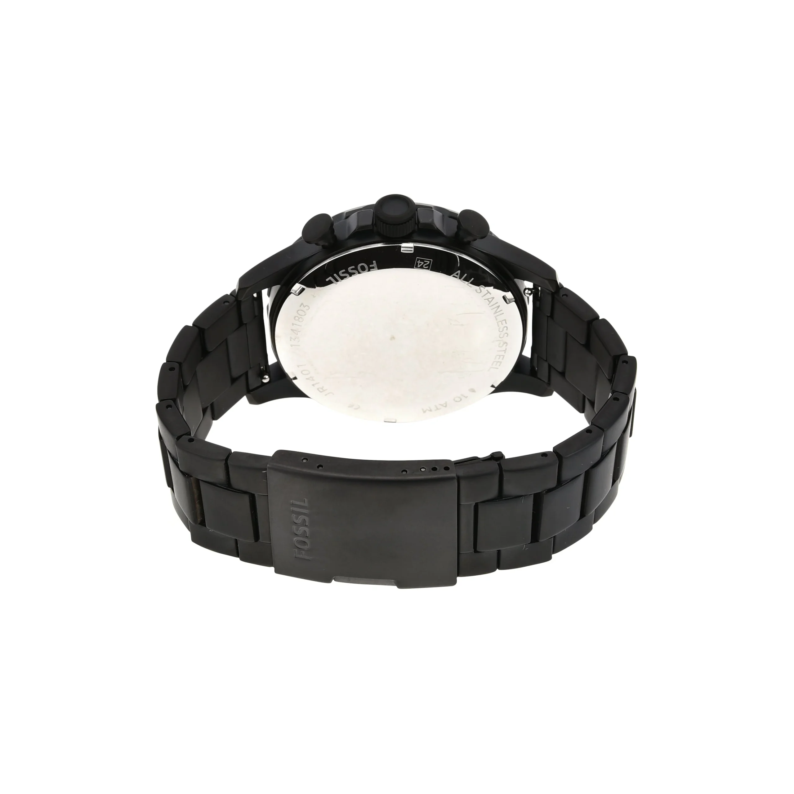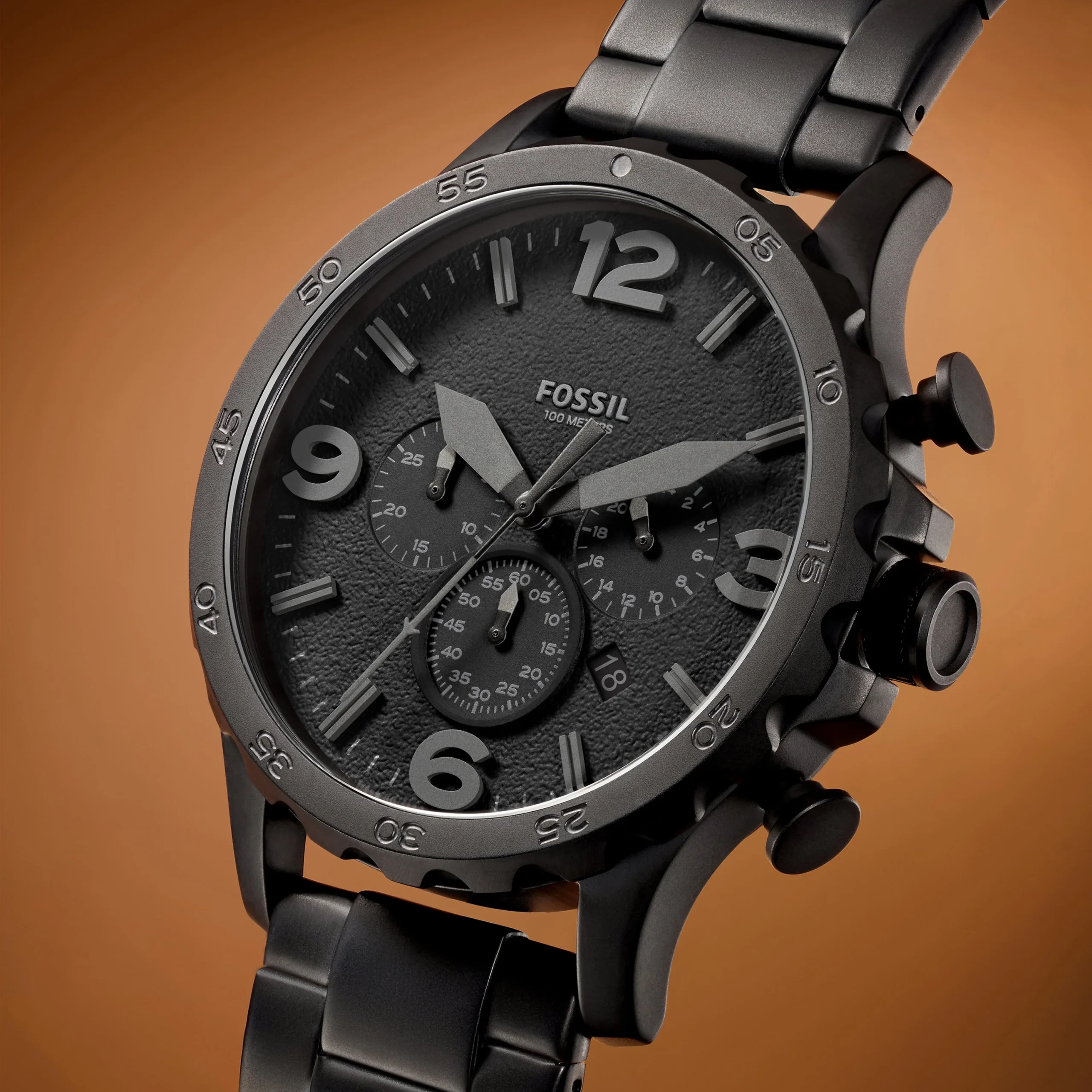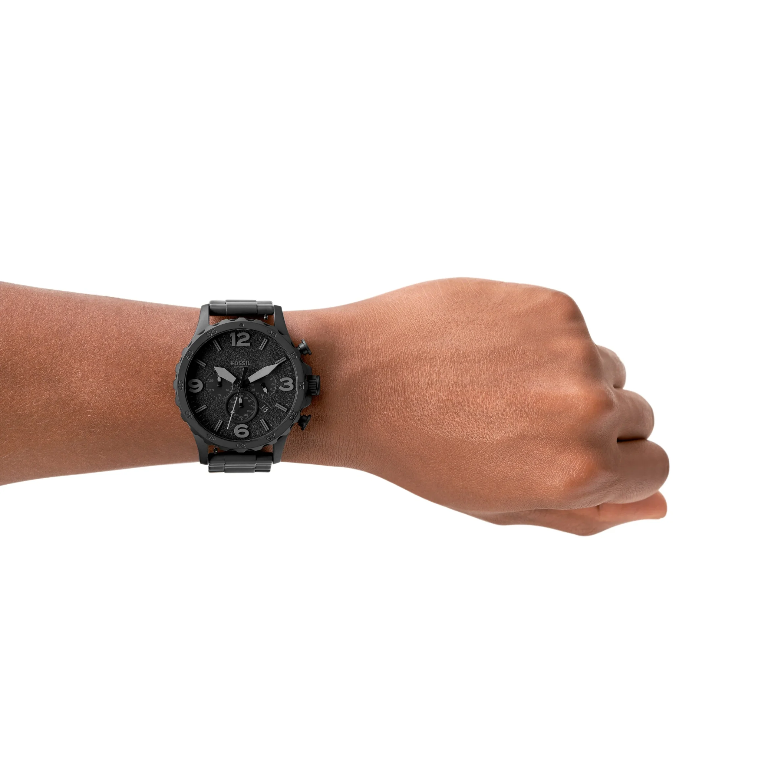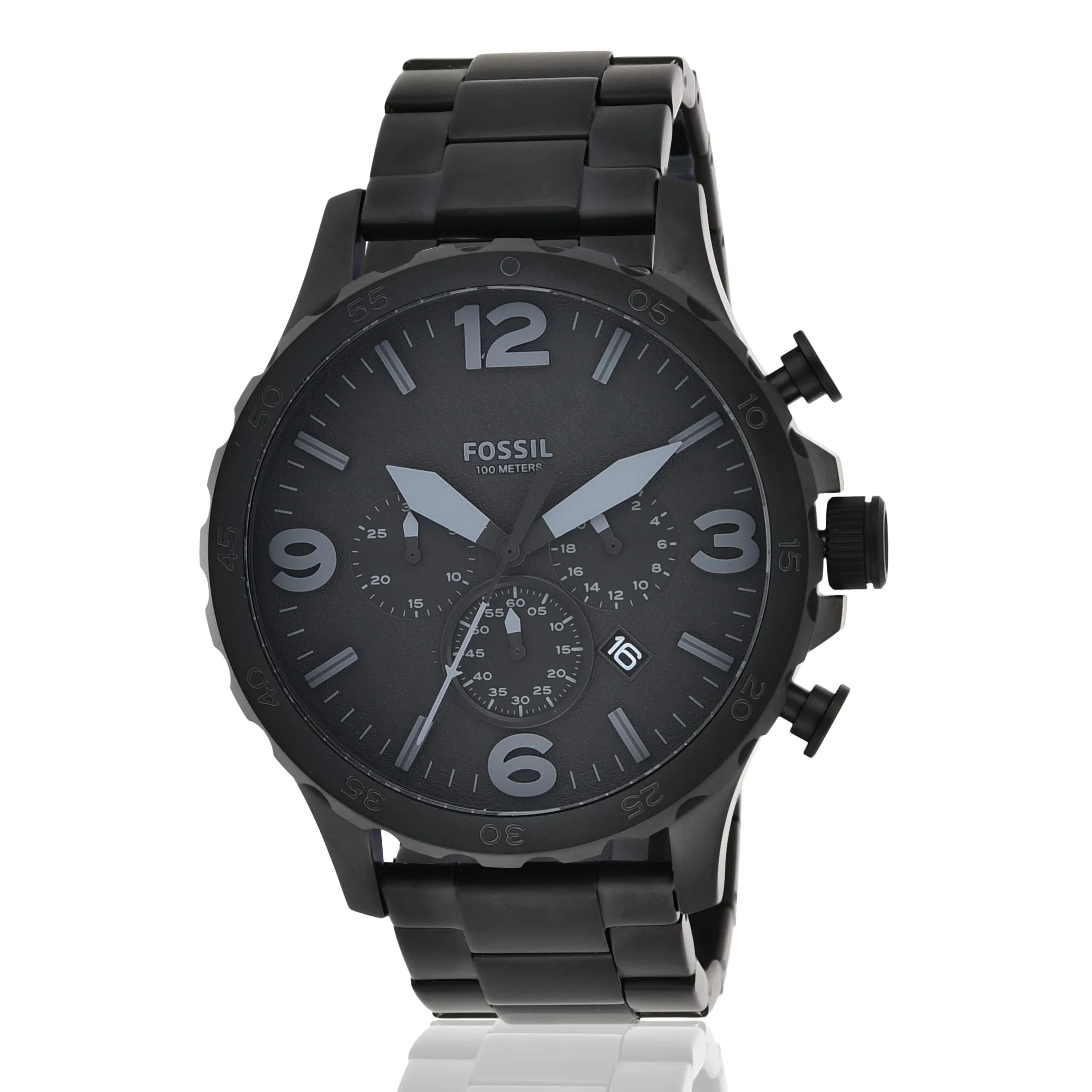 The Fossil Nate Chronograph JR1401 men’s watch is a bold statement in matte black, designed for those with a taste for rugged sophistication. Crafted with a robust 50mm stainless steel case and matching three-link bracelet, it blends sporty function with refined style. The black dial features luminous Arabic indexes, precise chronograph sub-dials, and a date window, offering both clarity and complexity. Powered by a reliable quartz movement and protected by mineral glass, it’s built to endure with 100 meters of water resistance. Perfect for casual or sport settings, this watch reflects confidence and adventure in every detail.