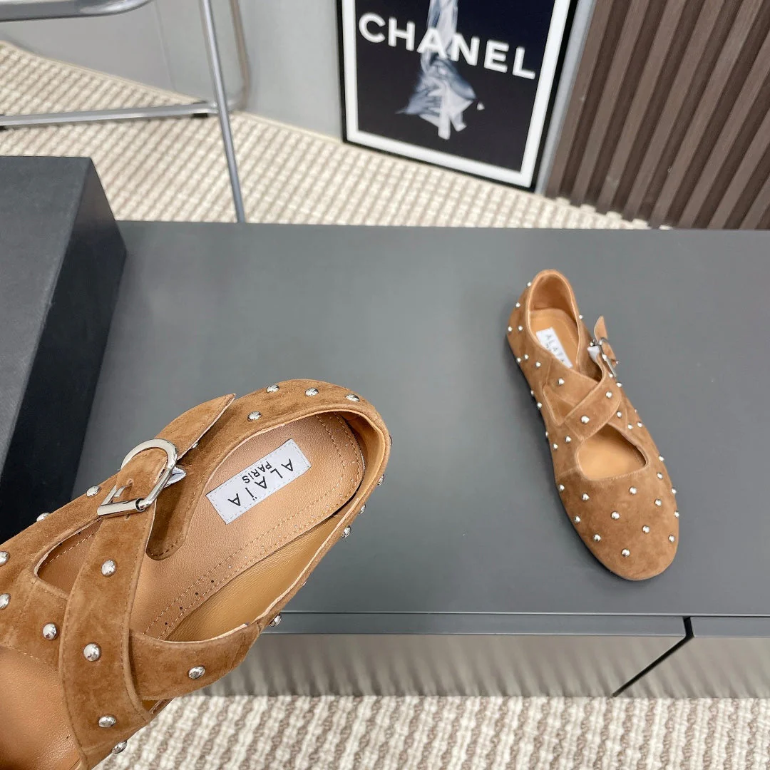 Alaia 2025 Criss Cross With Stud Ballet Flats Brown Beige Suede 293207
