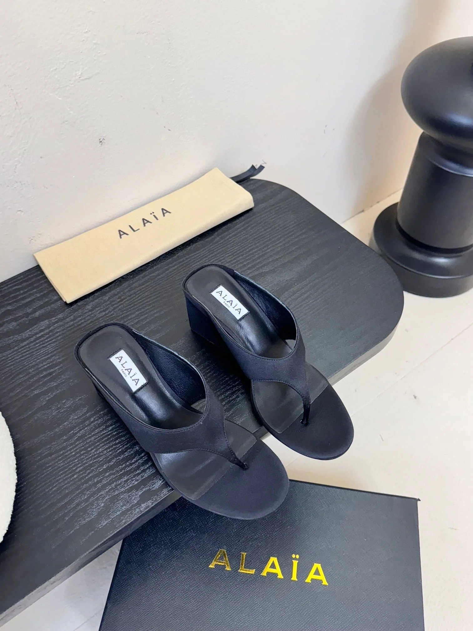 Alaia 25 Cube Thong Mules Black Satin Sheepskin 297039
