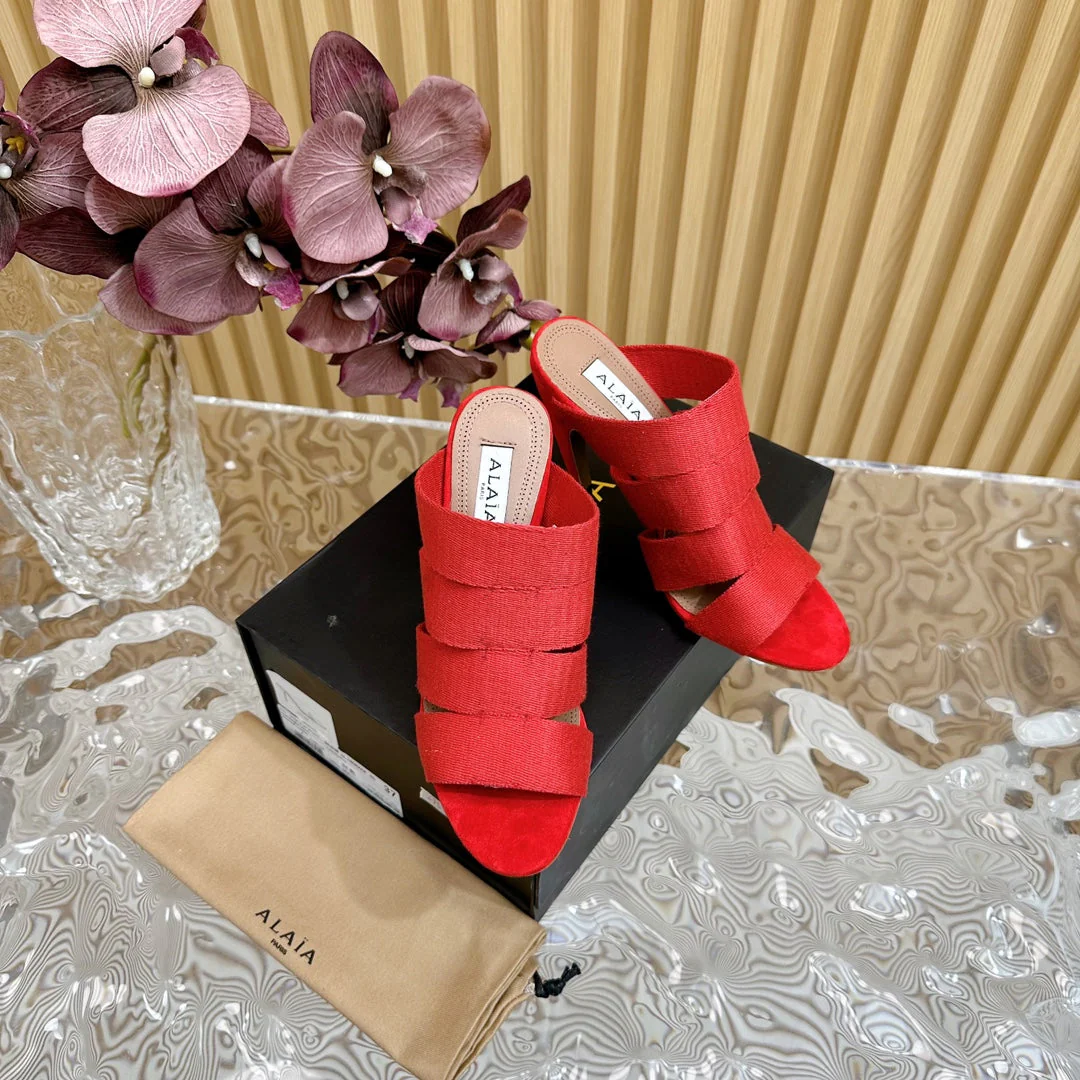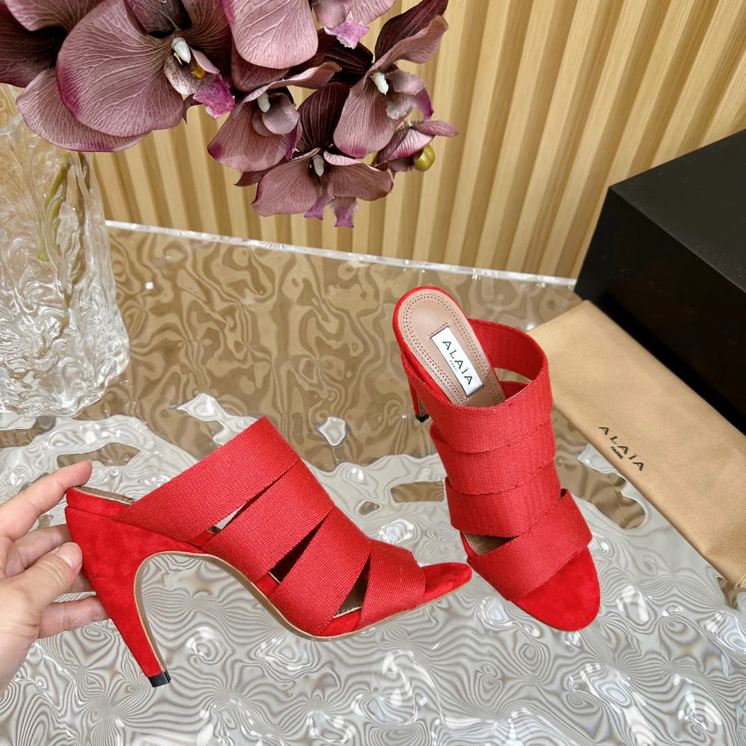 ALAIA ELASTIC CAGE MULE SANDALS IN CHERRY RED WOVEN STRAP AND LAMBSKIN