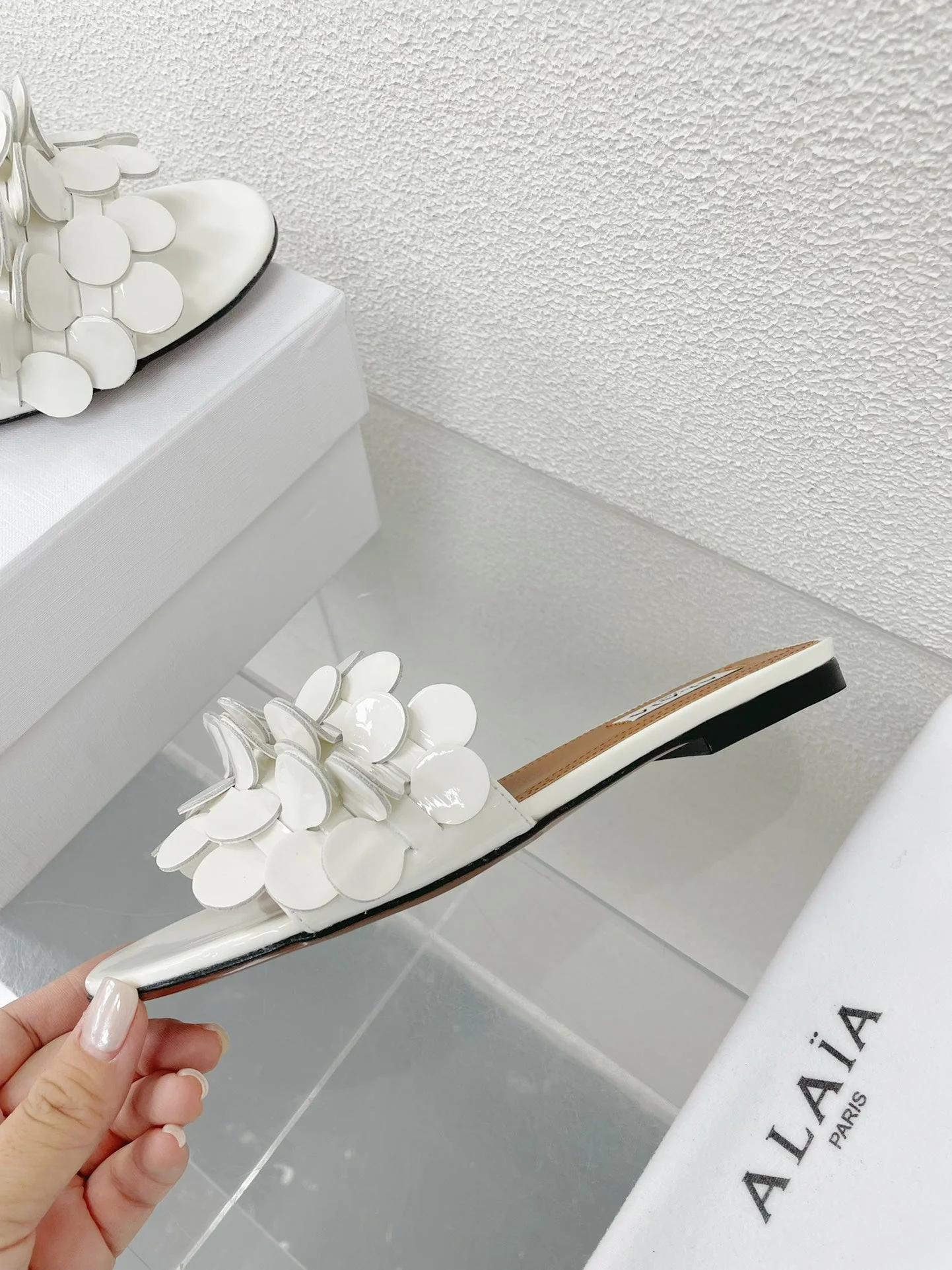 ALAIA FLAT MULE IN WHITE GLOSSY LAMBSKIN