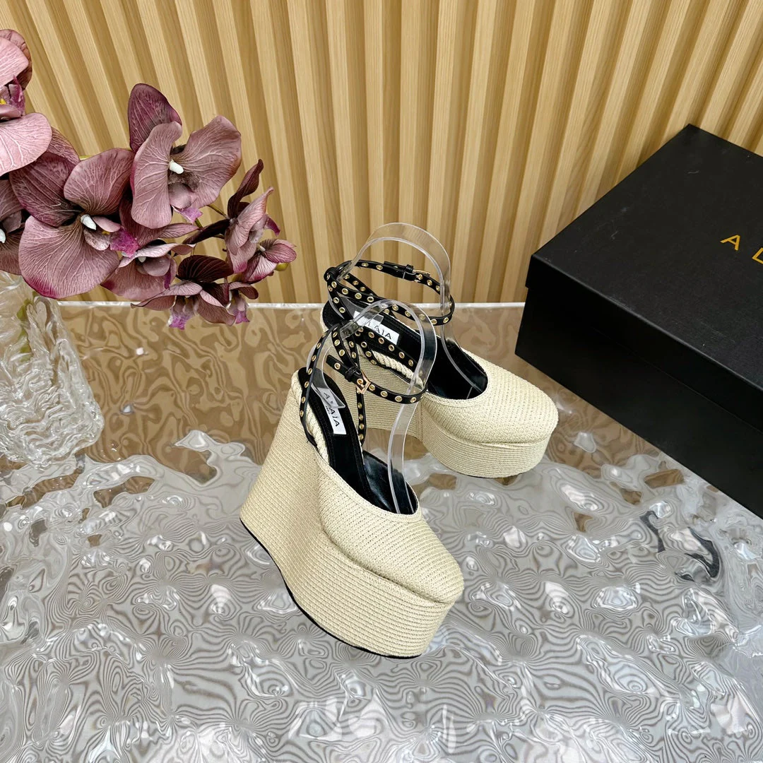 ALAIA LA WEDGE SANDALS IN WHITE PAPER STRAW