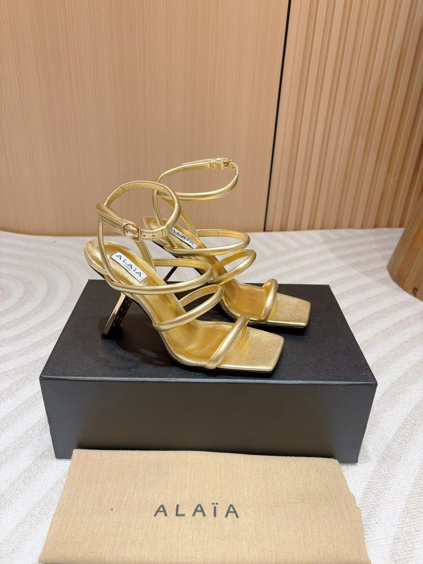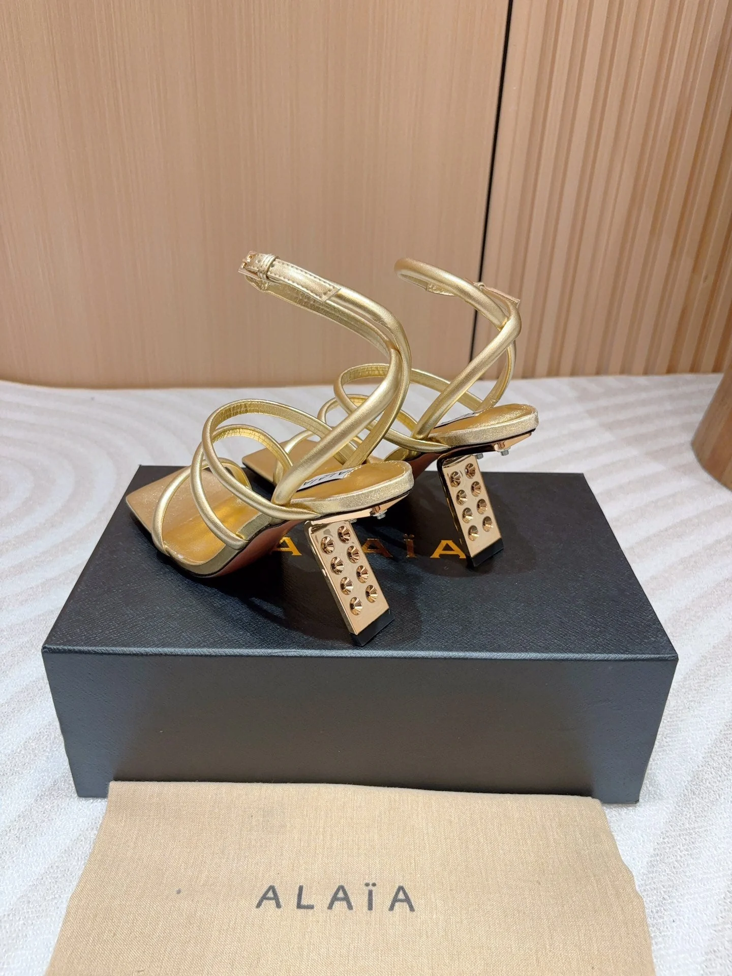 ALAIA THREE-STRAPS HIGH HEEL SANDALS IN GOLDEN PATENT LAMBSKIN