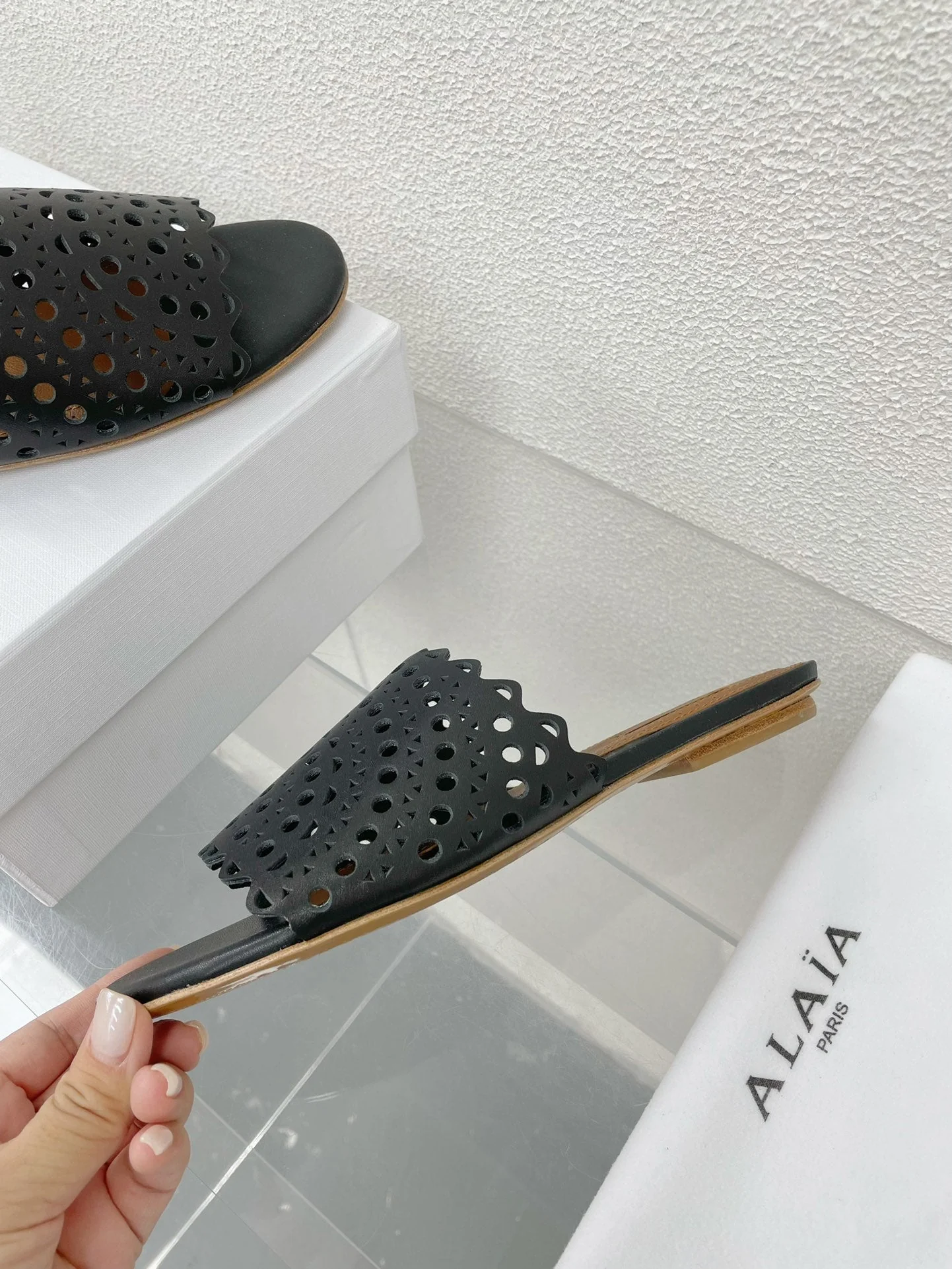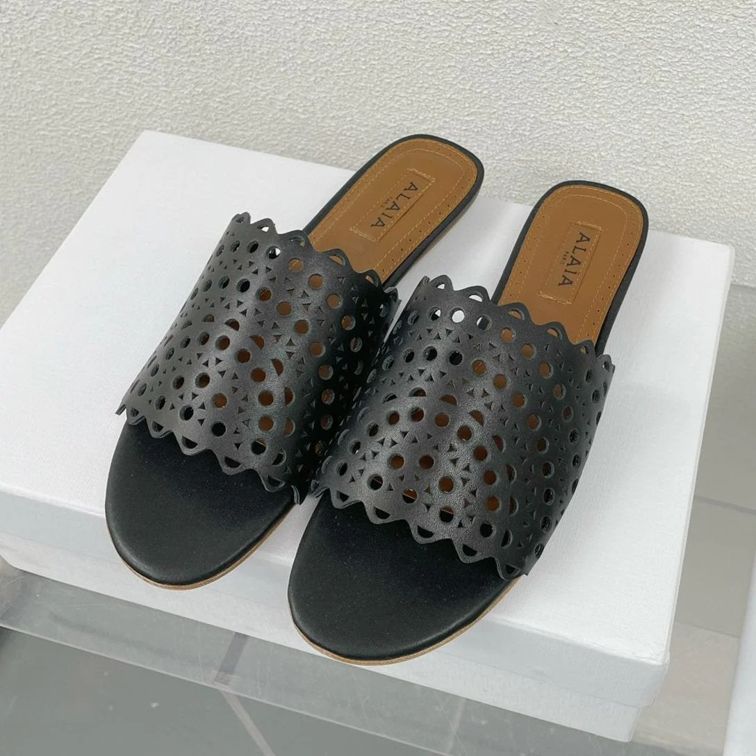 ALAIA VIENNE FLAT MULES IN BLACK LAMBSKIN
