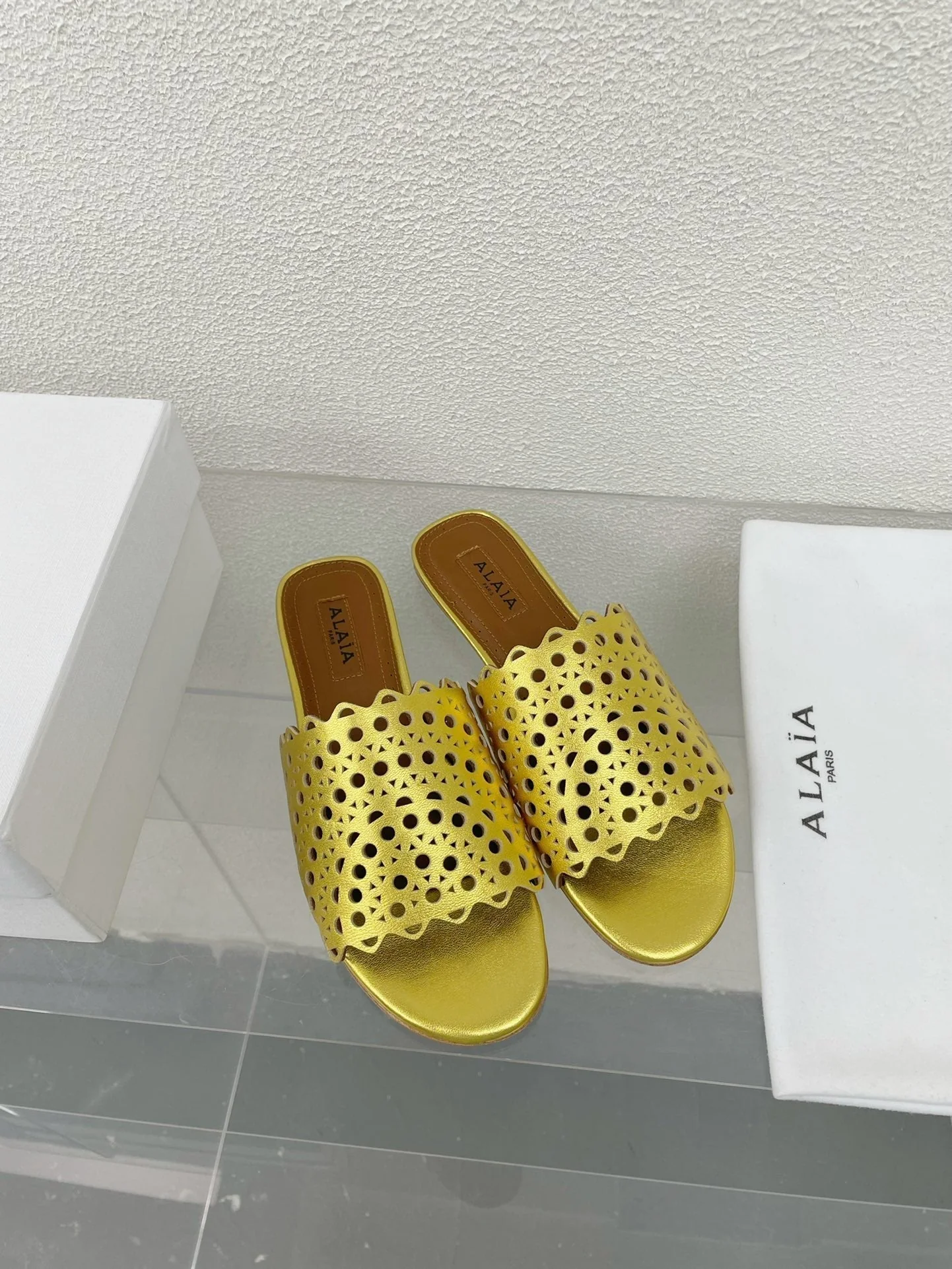 ALAIA VIENNE FLAT MULES IN GOLDEN LAMBSKIN