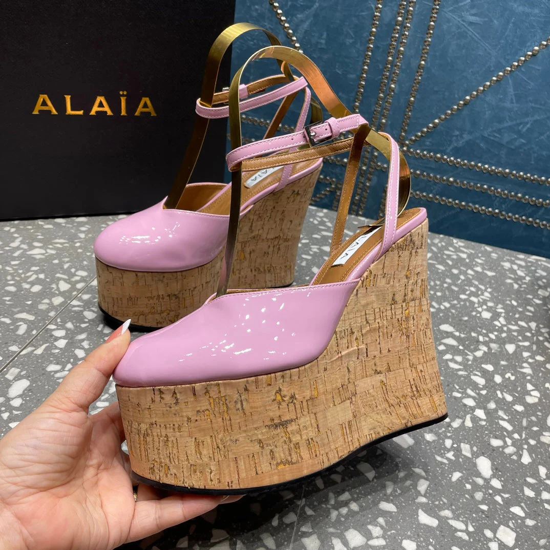 ALAIA WEDGE PUMP 15 CM IN NEON PINK LAMBSKIN AND BEIGE RUBBER