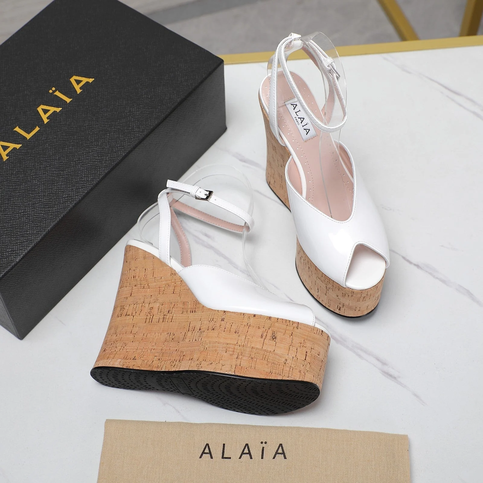 ALAIA WEDGE SANDAL IN WHITE GLOSSY CALFSKIN AND BEIGE RUBBER