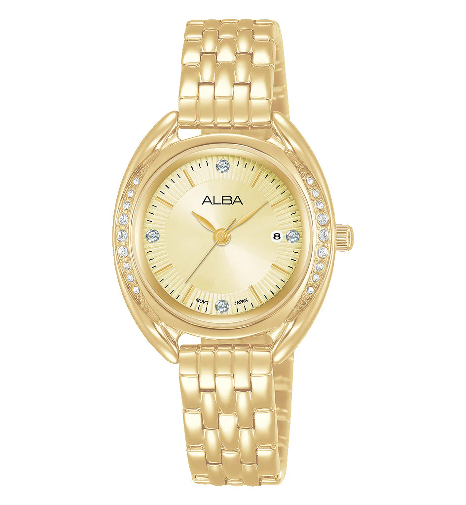 Radiating refined elegance, the Alba Fashion AH7Y80X1 women’s watch is a graceful accessory crafted to elevate any ensemble. Designed in Japan by the Seiko Watch Corporation, this dress watch features a gold stainless steel bracelet and a gold-plated case adorned with shimmering crystal accents, offering timeless charm and sophistication. The champagne dial with baton markers is protected by dome-shaped mineral crystal glass, combining beauty with everyday durability. A subtle date display and water resistance up to 30 meters add functionality to its polished design. With quartz movement for reliable precision and a 3-year warranty, this women’s watch is a perfect blend of fashion and performance in the luxury timepiece category.