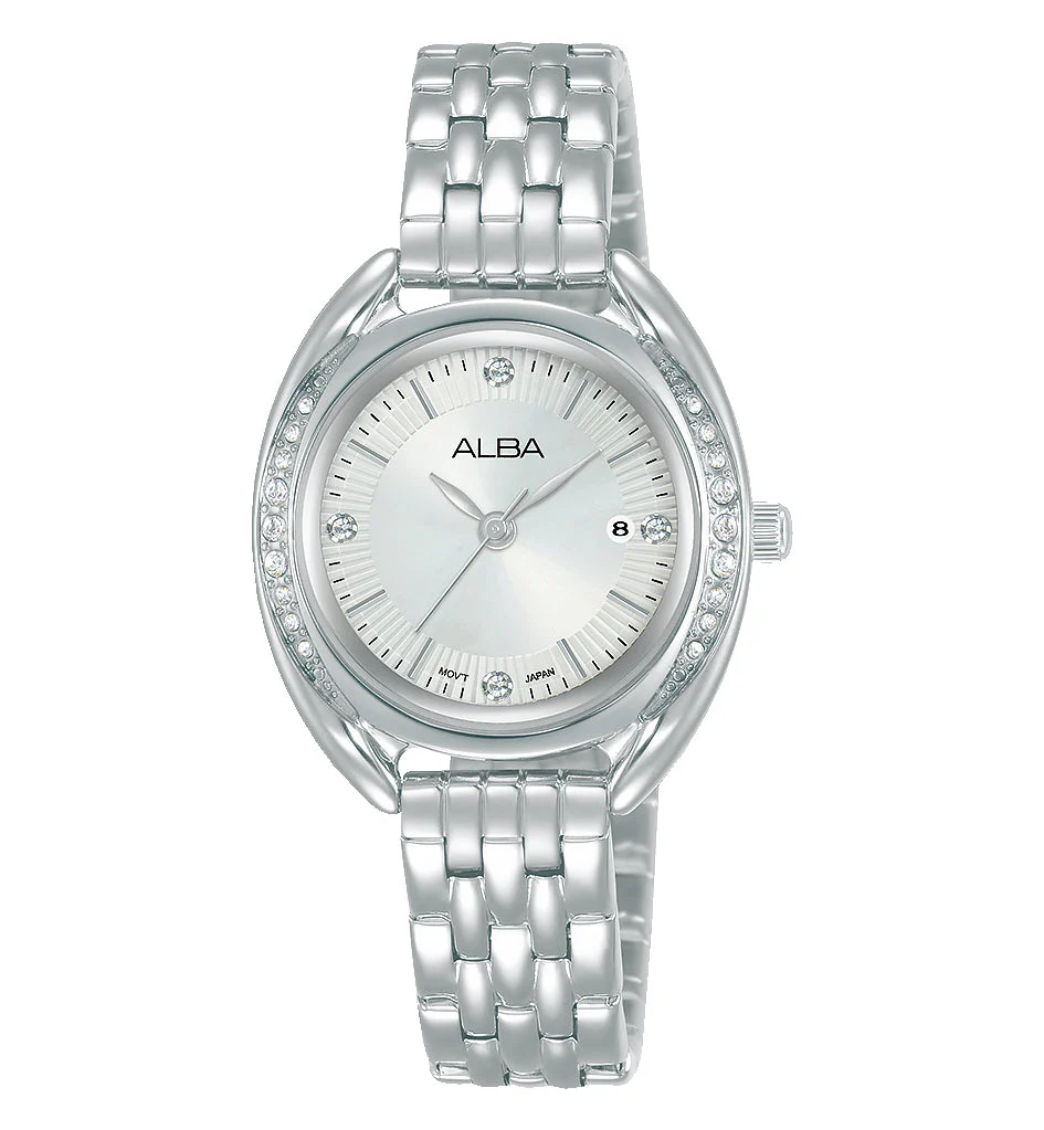 Gracefully refined, the Alba Fashion Ladies Dress Analogue Watch AH7Y93X1 blends timeless elegance with everyday versatility. Designed for women who appreciate subtle sparkle and polished detail, this dress watch features a 29mm stainless steel case and a sleek silver stainless steel bracelet. The white dial is accented with baton markers and set under a durable mineral crystal glass for lasting clarity. A discreet date display adds practical charm, while crystal embellishments along the bezel lend a delicate shimmer. Water resistant up to 30 meters and powered by precise quartz movement, it offers both style and reliability. Ideal for elevating moments from day to night, this women’s watch comes with a 3-year warranty and classic Alba box presentation, making it a perfect accessory or gift in the watches category.