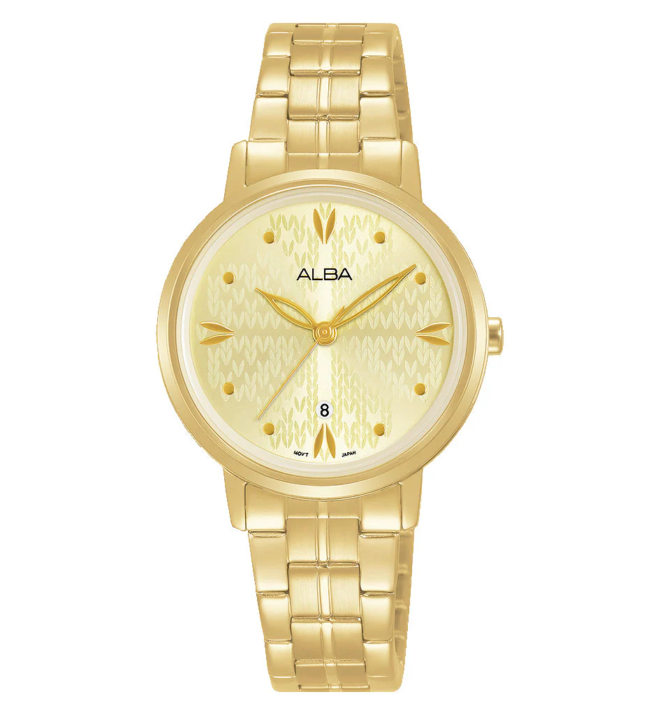 Refined and radiant, the Alba Fashion Ladies Dress Analogue AH7Y96X1 elevates everyday elegance with its gold stainless steel case and bracelet, offering a timeless charm meticulously crafted for women. This women’s watch features a champagne dial adorned with sleek baton markers beneath a protective mineral crystal glass, blending classic design with modern sophistication. The 30mm case size provides a delicate yet impactful presence on the wrist, making it an ideal accessory for both daywear and evening ensembles.