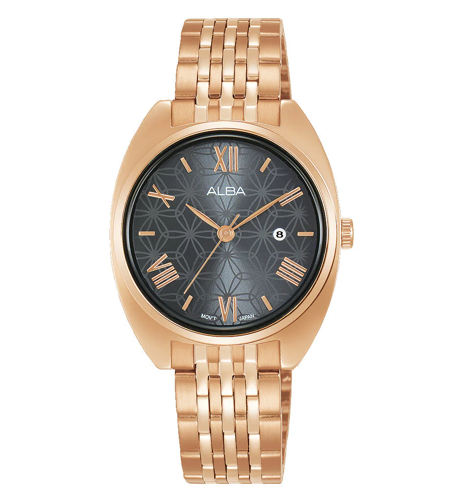 Refined and radiant, the Alba Fashion Ladies Dress Analogue Watch AH7Z08X1 blends timeless elegance with contemporary charm. Crafted with a rose gold stainless steel bracelet and a gold-tone plated case, this women’s watch exudes sophistication perfect for both everyday wear and special occasions. The black dial features sleek baton and Roman numeral markers, complemented by a subtle date display, all protected under a dome-shaped mineral crystal glass. Powered by reliable quartz movement and water resistant up to 30 meters, it combines functionality with grace. At 30mm, its case size strikes a perfect balance of presence and delicacy within the dress watch category. A 3-year warranty ensures peace of mind, making this a luxurious yet practical choice in women’s watches.