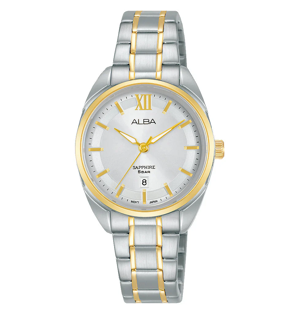 Refined elegance meets everyday sophistication with the Alba Prestige Ladies Dress Analogue AH7Y52X1. Crafted with a polished two-tone silver and gold stainless steel bracelet, this women’s watch exudes timeless charm. The 29mm stainless steel case frames a sleek silver dial accented by delicate baton hour markers and a date display, protected by durable sapphire crystal glass. Designed for modern women who appreciate classic aesthetics, it offers 50 meters of water resistance and precise quartz movement for reliable performance. Within the apparel and accessories category, this dress watch stands out for its harmonious blend of Japanese craftsmanship and European-inspired design. Backed by a 3-year warranty, it’s a graceful choice for formal occasions or everyday elegance.