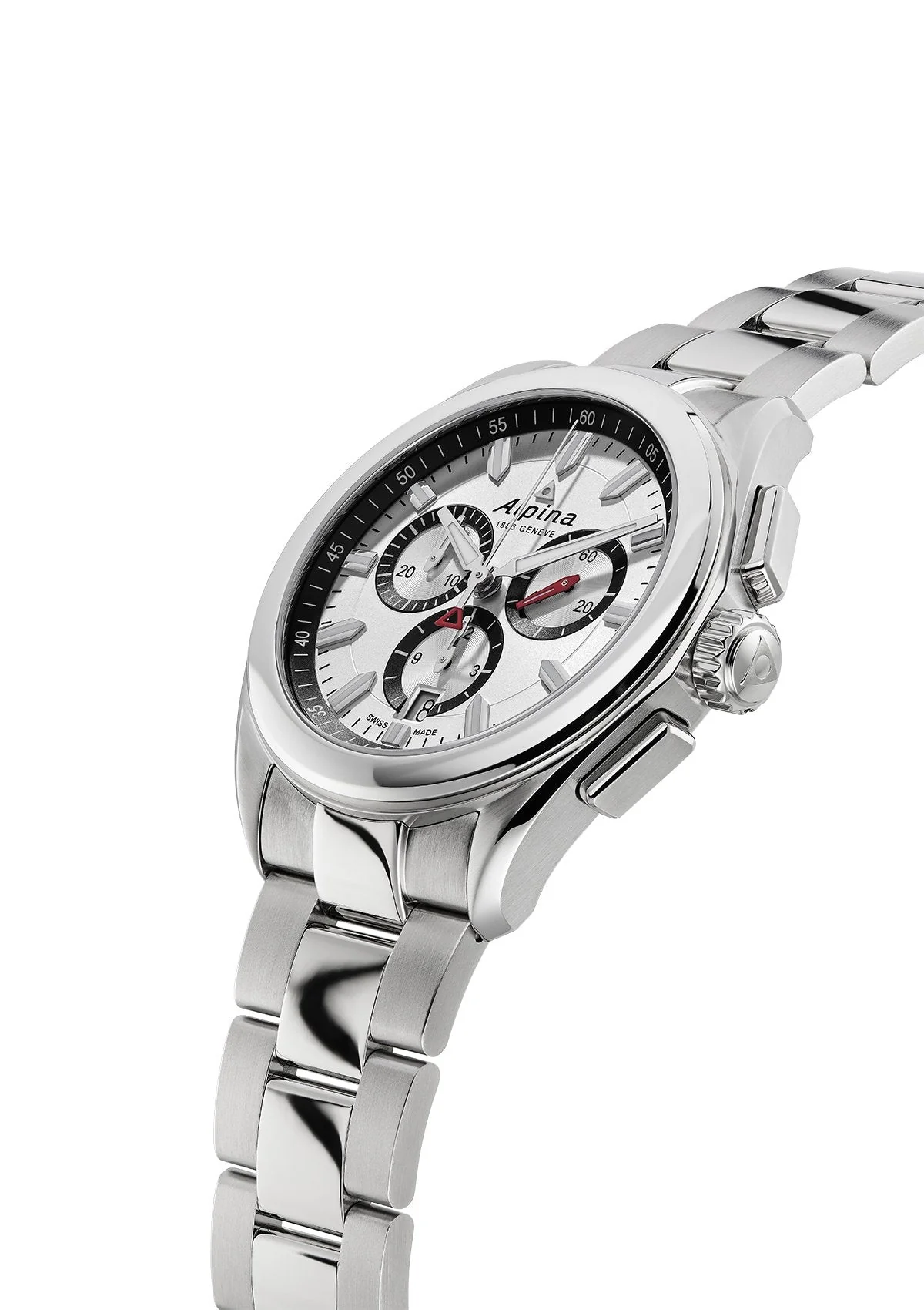 The Alpina Alpiner Quartz Chronograph AL-373SB4E6B is a refined men’s watch that combines precision quartz movement with a sleek design rooted in Swiss heritage. Its brushed and polished 42mm stainless steel case is matched with a three-link bracelet, offering both durability and a polished presence for dress, sport, or luxury occasions. The silver sunray dial features hand-polished luminous hands, three chronograph subdials, and a discreet date display, all protected under a convex sapphire crystal. Powered by the AL-373 caliber with a 54-month battery life and 13 jewels, this timepiece is engineered for lasting performance. Water-resistant up to 100 meters and equipped with a fold-over clasp, it brings confidence and functionality to any setting. Ideal for those who value craftsmanship and timeless style in high-end chronograph watches.