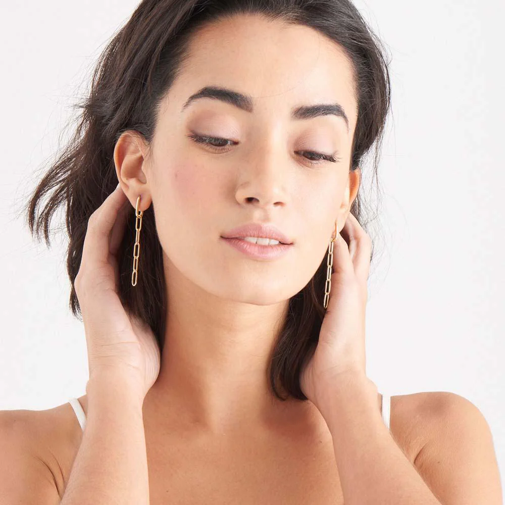 Delicately crafted from 925 sterling silver with a radiant 14kt gold plating, the Ania Haie Cable Link Drop Earrings capture modern sophistication in a refined silhouette. Each elongated chain exudes a sense of effortless luxury, offering a chic statement with its 7cm drop length. Part of the acclaimed Chain Reaction Collection, these gold earrings infuse any look with distinctive style while ensuring durability and comfort. Perfect for elevating both everyday and occasion wear, they embody the innovative spirit and reputation for quality of Ania Haie jewelry in the premium earrings category.